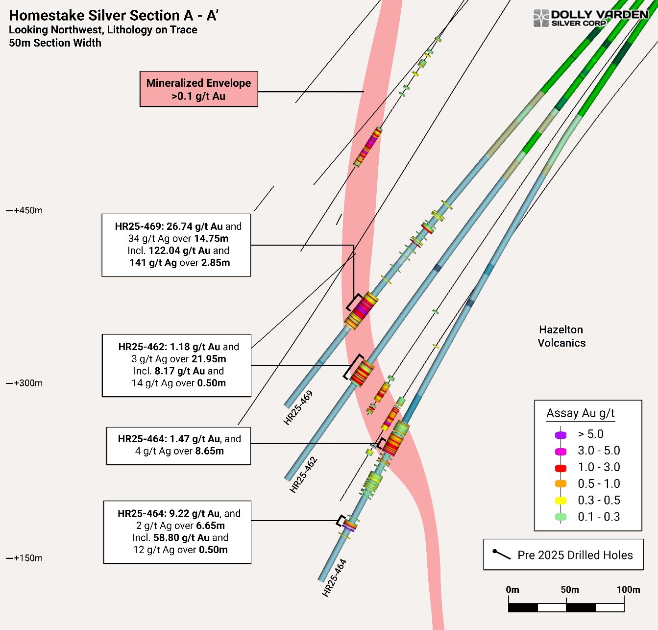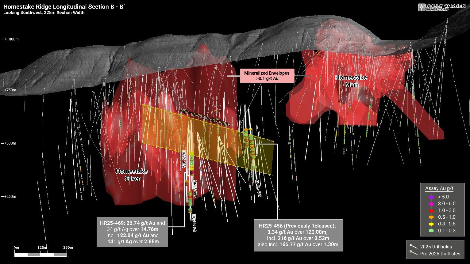 Vancouver, British Columbia--(Newsfile Corp. - November 10, 2025) - Dolly Varden Silver Corporation (TSXV: DV) (NYSE American: DVS) (FSE: DVQ) (the "Company" or "Dolly Varden") is pleased to report results from drilling that expands the high-grade gold zone within the Homestake Silver deposit. Hole HR25-469 targeted a large open area at the Homestake Silver Deposit, intersecting 26.74 g/t Au over 14.75 meters, including 122 g/t Au over 2.85 meters within a broader mineralized zone grading 12.13 g/t Au over 33.80 meters.