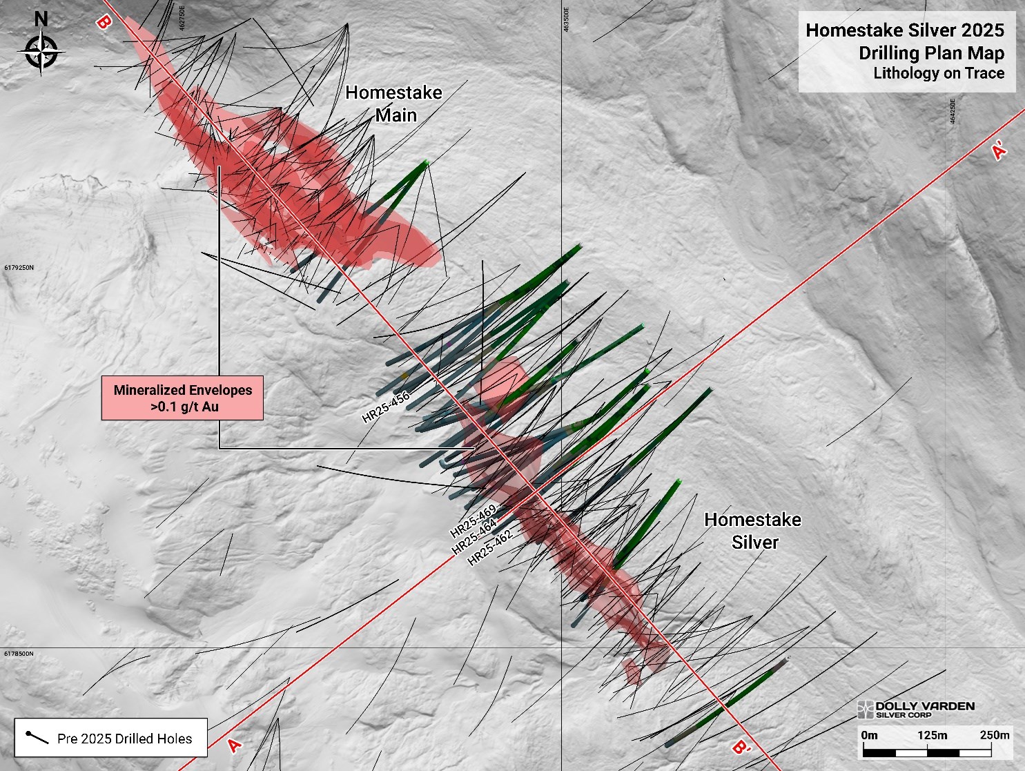 Figure 4. Plan of Homestake Ridge >0.1g/t Au mineralized zones (in red) highlighting all 2025 drilling completed with lithology on drill trace. The focus in the 2025 drilling was at Homestake Silver