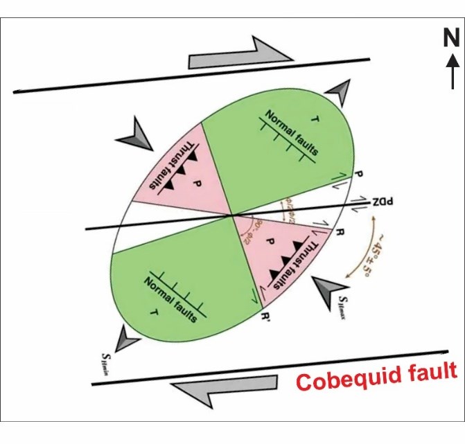 « Ces concentrations élevées de radon sont observées dans une zone tectoniquement complexe caractérisée par un soulèvement du socle, une déformation des roches sédimentaires et un environnement fortement influencé par la zone de faille Cobequid », a poursuivi le professeur Richer-Laflèche. « À West Advocate, les données préliminaires soulignent l'importance des structures secondaires situées au nord de la branche sud de la faille Cobequid (fig. 1). Étant donné que la zone de faille Cobequid présente une composante de décrochement dextre (latéral droit) importante, les structures secondaires parallèles ou à faible angle par rapport à la faille principale (cisaillements P) peuvent contrôler partiellement ou entièrement le transfert ascendant du radon et de l'hydrogène vers le sous-sol. De plus, des structures plus obliques suggérées par les données LiDAR et topographiques pourraient également faciliter la migration de ces gaz. »