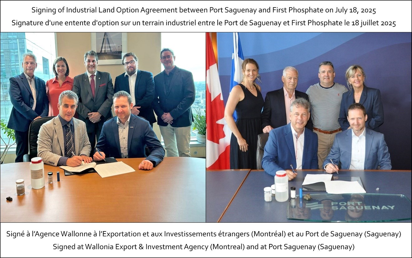 First Phosphate a récemment annoncé avoir conclu une entente d'option sur des terrains industriels (l'« Entente ») avec Port Saguenay. Cette entente couvre les terrains où la Société prévoit construire une usine d'acide phosphorique utilisant la technologie propre avancée de Prayon SA, société belge, mise en œuvre par la firme d'ingénierie internationale Ballestra S.p.A., basée en Italie. Les terrains situés à Port Saguenay offrent des avantages stratégiques et un positionnement concurrentiel, notamment :
