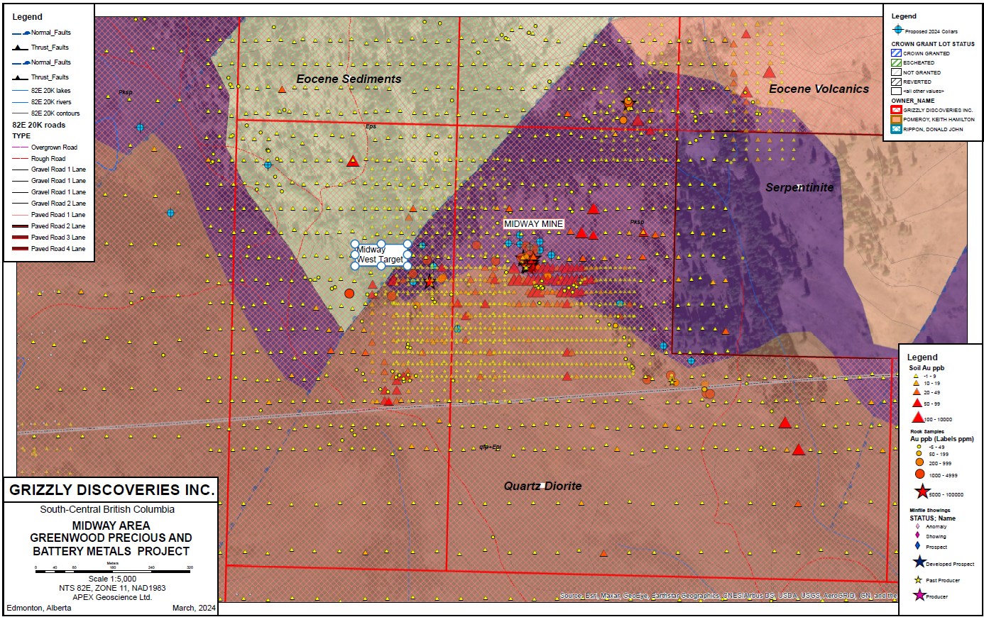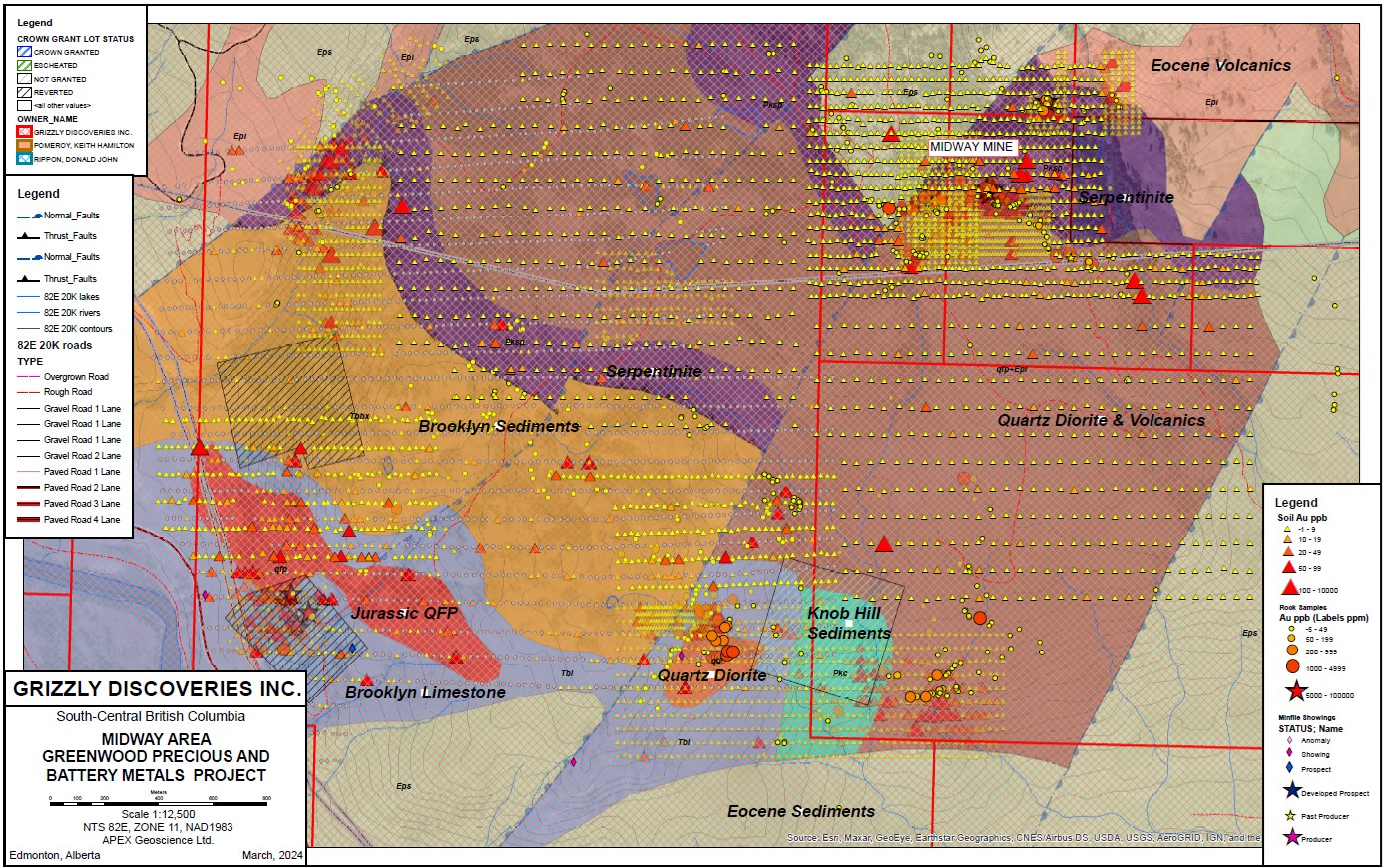 Figure 2. Midway geology and showings with gold in soils and rocks.