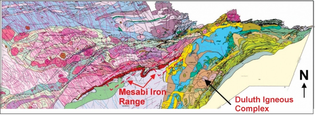 Figure 1. Carte géologique simplifiée montrant les unités de la chaîne ferrifère de Mesabi et celles du complexe intrusif de Duluth dans le Minnesota. Carte modifiée d'après Jirsa et al., 2011.
