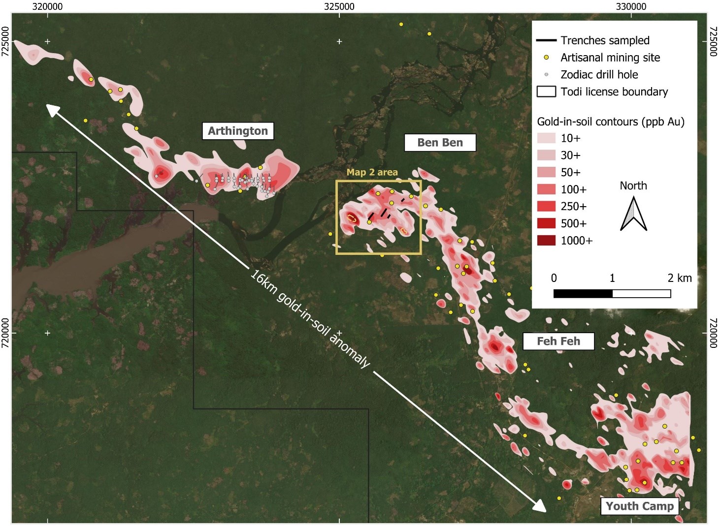 Vancouver, British Columbia--(Newsfile Corp. - December 1, 2025) - Zodiac Gold Inc. (TSXV: ZAU) ("Zodiac Gold" or the "Company"), a West African gold exploration company, is pleased to announce the results of its initial trenching program at the highly prospective Ben Ben target, part of the Company's flagship Todi Gold Project in Liberia. Ben Ben is one of five priority targets within the Todi Gold Project, and lies within a 16 km gold-in-soil anomaly on the Todi Shear Zone (Map 1).