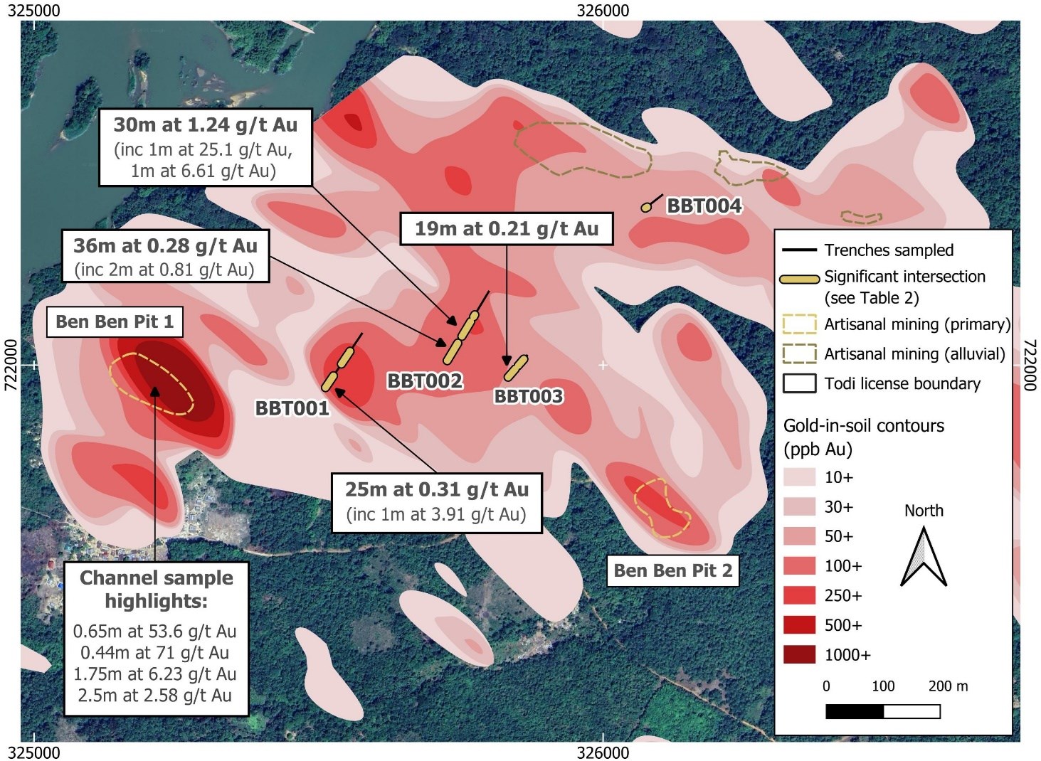 David Kol, CEO of Zodiac Gold, commented: "These results are the first step in validating the continuity of gold mineralized zones outside the artisanal workings at Ben Ben and we are excited to report wide mineralized zones including higher grade intervals of 25.1 and 6.61 g/t Au. After our success at the Arthington Discovery 1.3km along strike to the west-northwest of Ben Ben, this work represents a further step towards demonstrating the full potential within the 16km gold-in-soil anomaly from Arthington to Youth Camp."