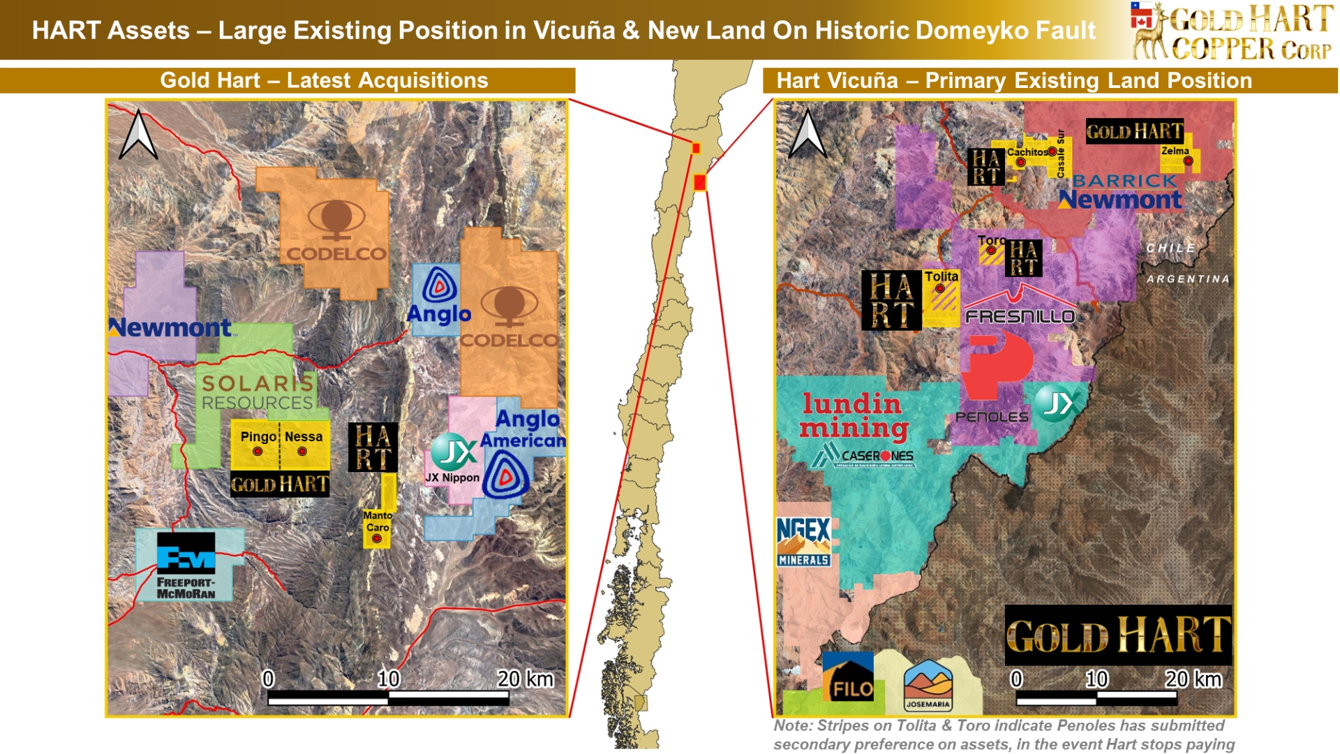 Gold Hart Copper is one of the largest independent land owners surrounding major miners where the famous Maricunga Gold Belt meets the emerging Vicuña Copper Belt in Chile. HART is actively acquiring, exploring and developing its portfolio of gold, copper & silver properties adjacent to the largest gold and copper assets on the continent.