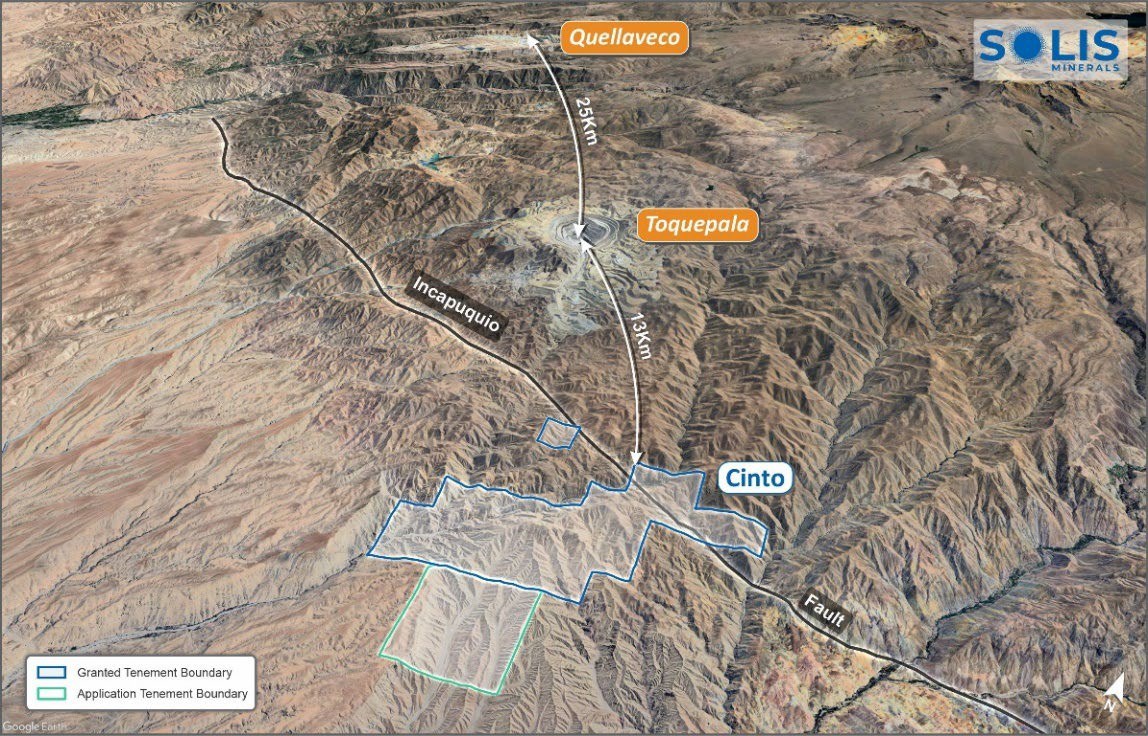 Cinto is 15 kilometres from Southern Copper's Toquepala mine and 38 kilometres from Anglo American's Quellaveco mine, which produces > 300 ktpa of copper1. Cinto sits along the Incapuquio Fault Zone, which is associated with world-class porphyry deposits in the region.