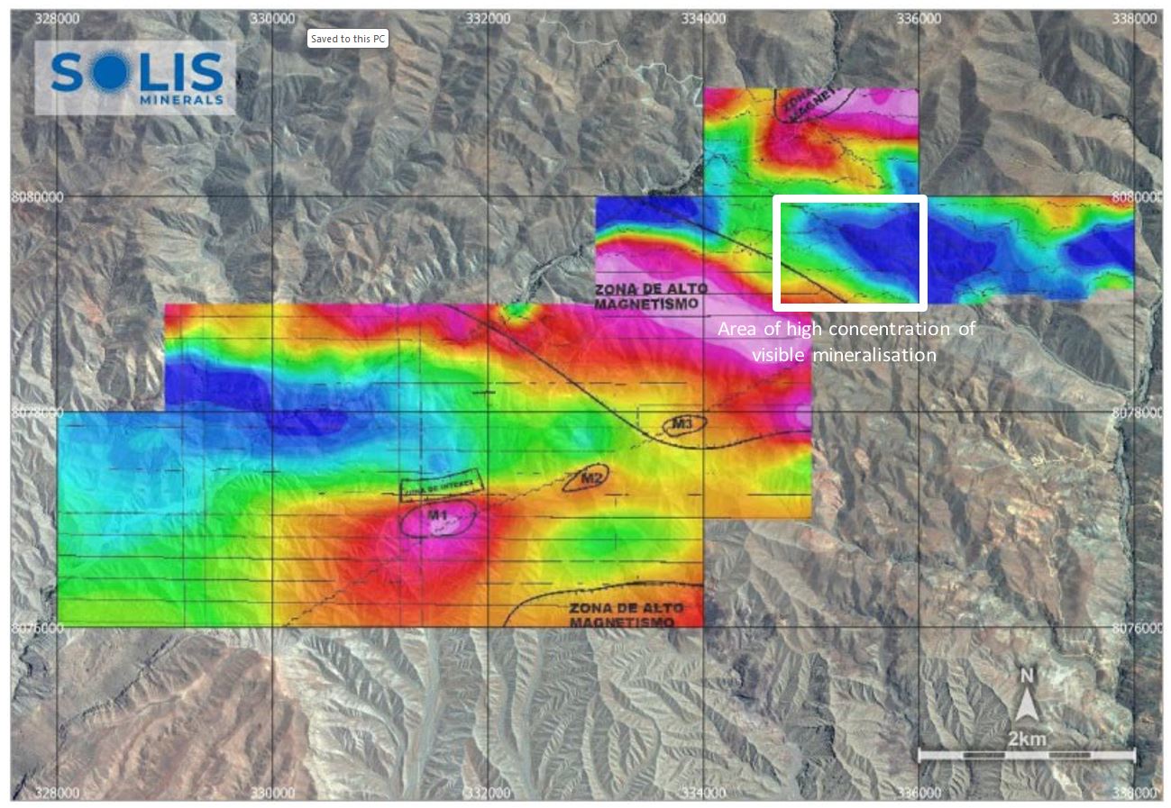 - Magnetometry survey: a combined drone and ground magnetometry survey over Cinto has been completed2. The previously released survey shows magnetic anomalies south of an intrusive batholith contact with corresponding alteration detected from World View 3 remote sensing work. Areas of low magnetic response north-east of the batholith contact represent alteration that contains the area of visible copper mineralisation present at Cinto (Figure 2).