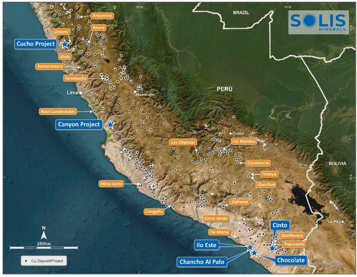 Figure 5: Solis Minerals' portfolio of projects in Peru (blue boxes) with major mining operations and projects also identified.