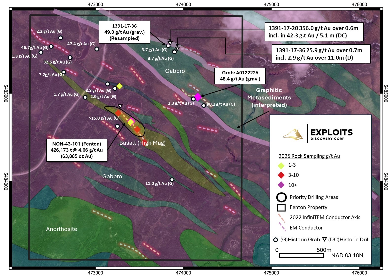 "Phase 1 work at Fenton has exceeded our expectations. It confirmed high-grade gold at surface and in resampled historic core, gave us a clearer understanding of the mineralized system, and identified multiple drill-ready untested EM targets," said Jeff Swinoga, CEO and President of Exploits. "Fenton already benefits from a historical mineral resource estimate of 63,885 oz Au (see Exploits' news release dated October 8, 2025, for details), and there has been substantial drilling and geophysical work completed on and around that deposit since then."