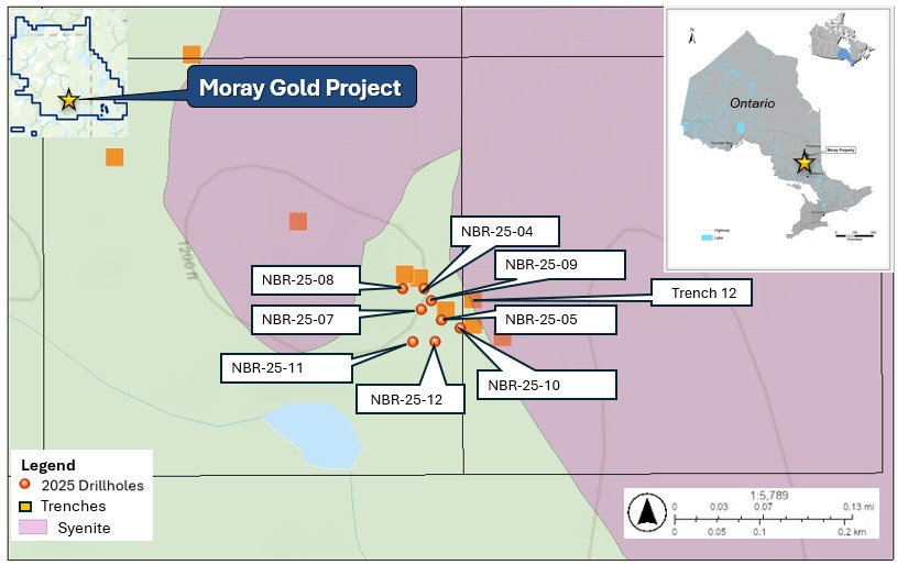 Figure 1 - Moray Property - Drillhole locations from Q3 2025 (NBR-25-04 to NBR-25-05) and Q4 2025 (NBR-25-07 to NBR-25-12) drilling in the Zavitz zone.