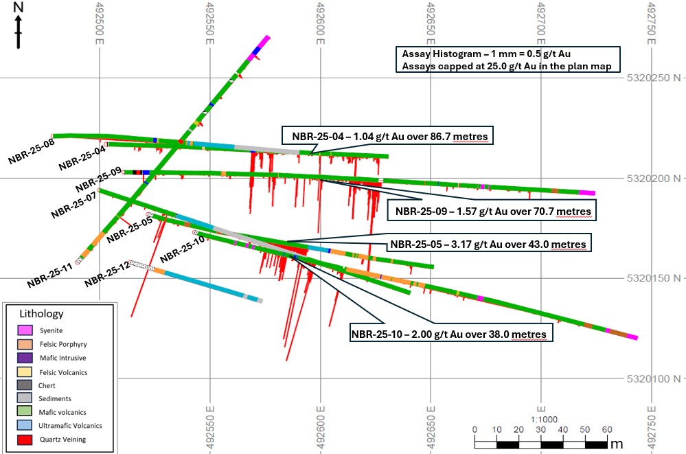 Figure 2 - Plan view of drillholes NBR-25-04, 05, 07-12 with assay results and lithologies.