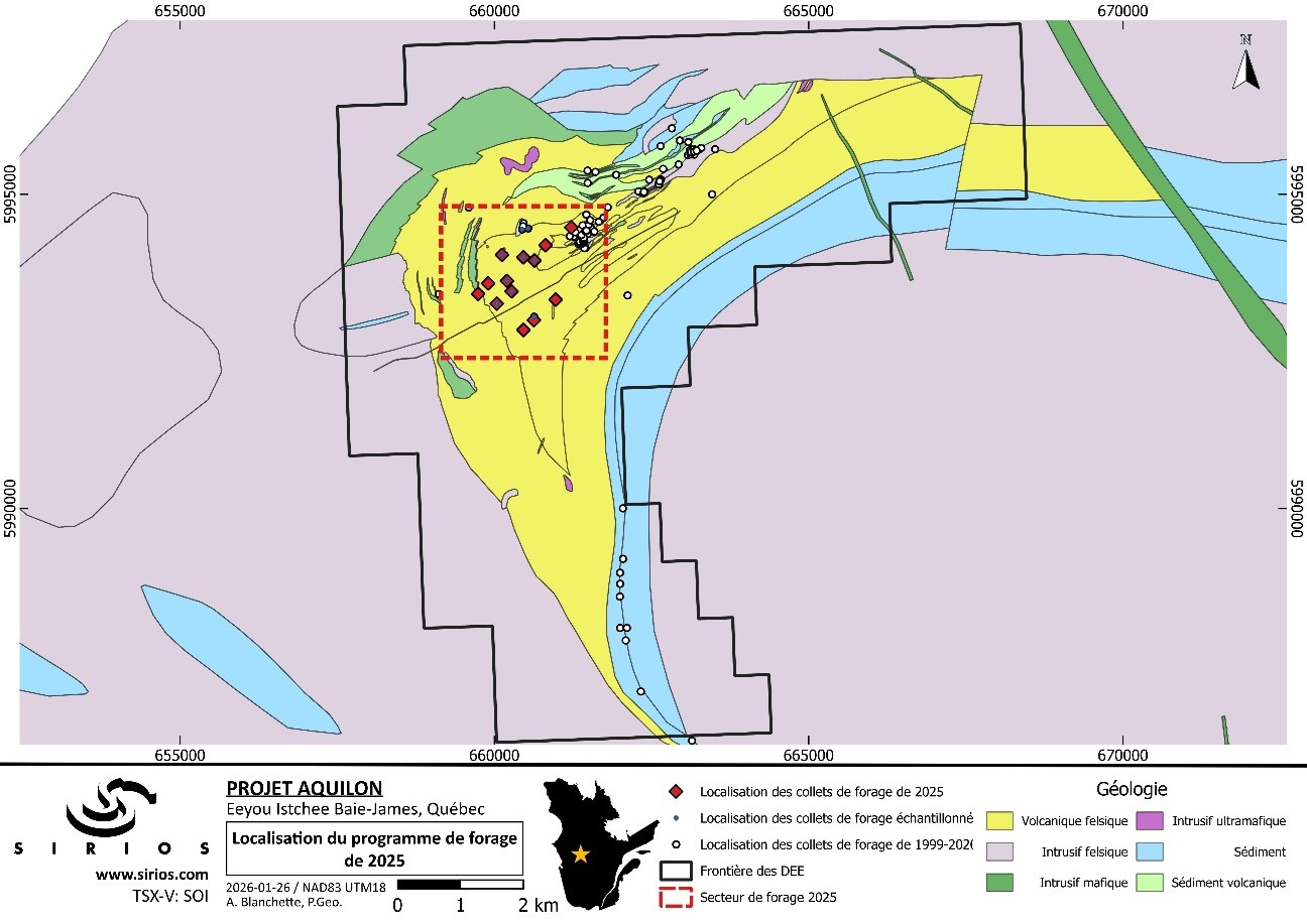Montréal, Québec--(Newsfile Corp. - 10 février 2026) - Ressources Sirios inc. (TSXV: SOI) présente les résultats d'analyses du programme additionnel d'échantillonnage sur 1 496 mètres de carottes de forage du projet aurifère Aquilon, dans la région d'Eeyou Istchee Baie-James, au Québec. Les résultats de six trous de forage, échantillonnés en continu sur toute la longueur des carottes, précisent davantage le halo aurifère découvert en 2025. Le halo s'étend latéralement sur plus de 700 m du sud vers le nord et sur 300 m de largeur à pendage vers l'est, conformément avec l'interprétation géologique et structurale du secteur.