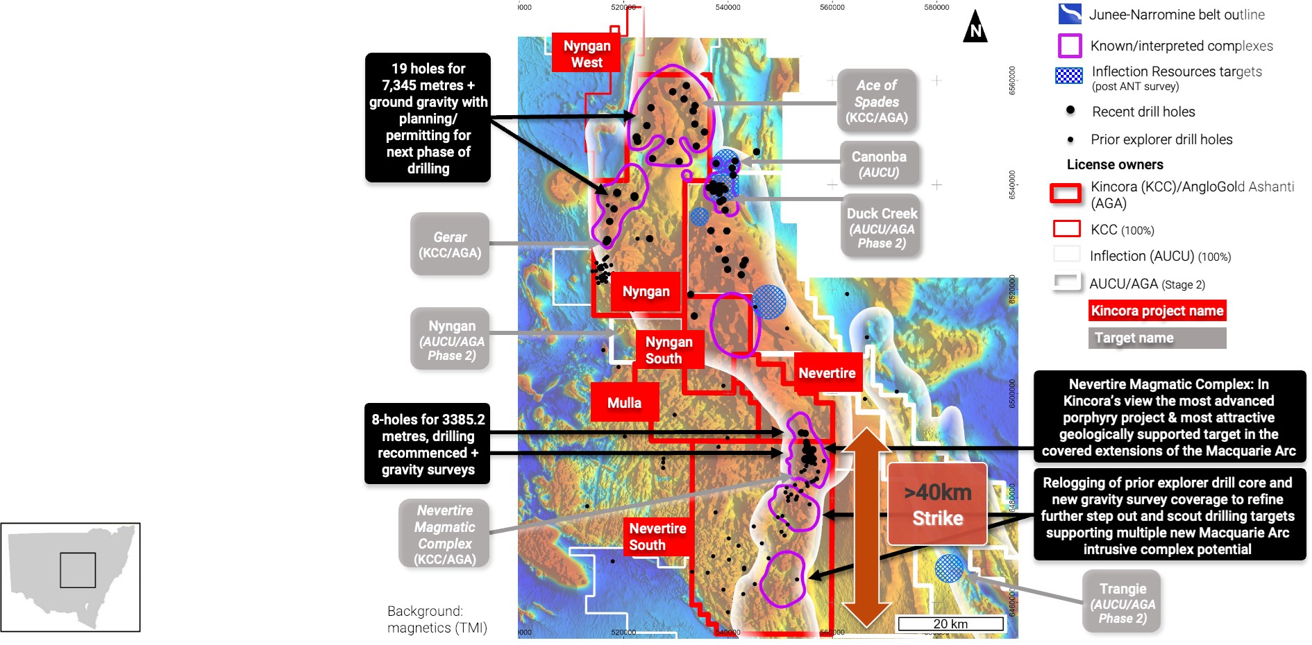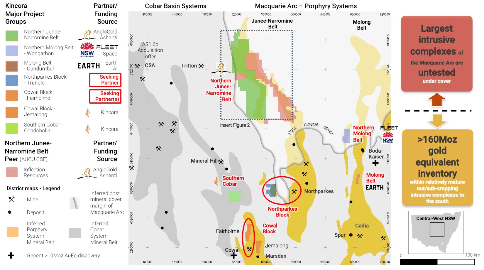 Figure 1: Kincora and AngloGold Ashanti have partnered to explore new district-scale undercover extensions of the world-class Macquarie Arc in the Northern Junee-Narromine Belt via two earn-in and joint venture agreements, currently aggressively drilling large greenfield targets