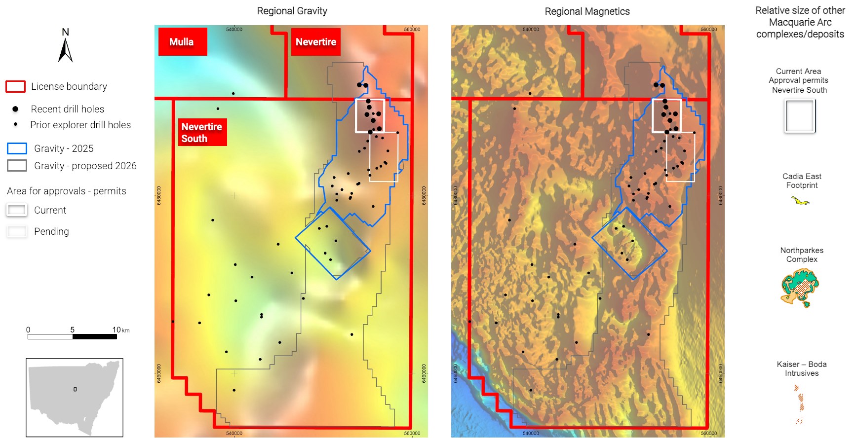 Scale increased to province-scale: Phase 1 results combined with a review of prior explorer drilling support a greater than six-fold increase in the prospective strike length across the Nevertire and Nevertire South licenses. An initial ~110km² gravity surveying has been completed as part of a planned ~400km² program. The results, together with historical core resampling, are expected to refine step-out and scout drilling targets across multiple newly interpreted Macquarie Arc intrusive complexes.
