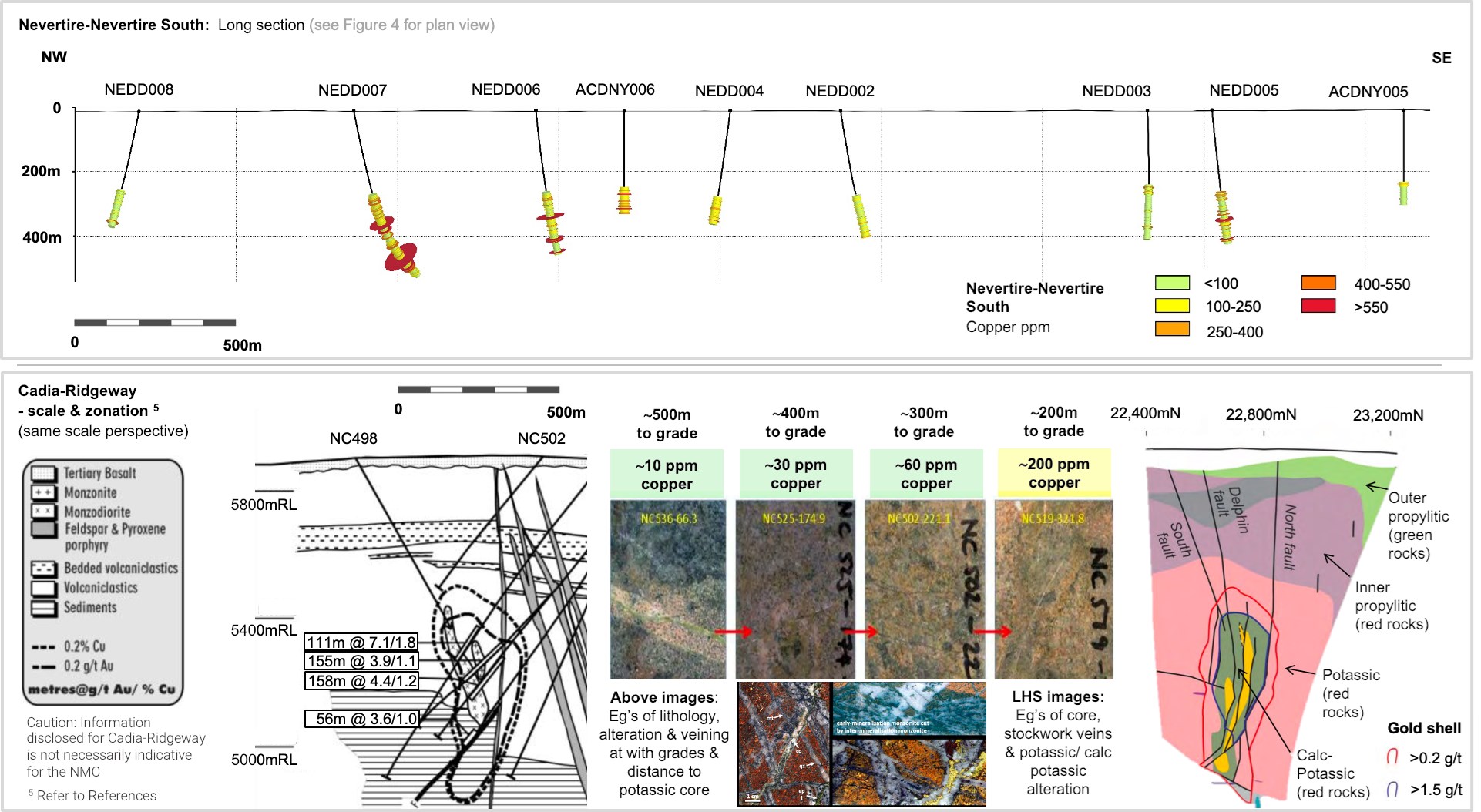 Newcrest holes ACDNY005 and ACDNY006 were drilled ~2.7km apart, in the central portion of the NMC, and returned "lithologies, alteration and veining consistent with a setting similar to the Cadia-Ridgeway and Goonumbla (Northparkes) porphyry Cu-Au deposits" 2. Kincora's relogging of these holes, led by technical director John Holliday, supported this interpretation.