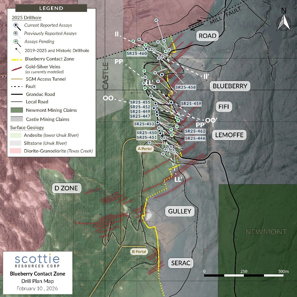 Vancouver, British Columbia--(Newsfile Corp. - February 10, 2026) - Scottie Resources Corp. (TSXV: SCOT) (OTCQB: SCTSF) (FSE: SR80) ("Scottie" or the "Company") is pleased to report new assays from its 2025 drilling of various zones within the Blueberry Contact Zone, at the Scottie Gold Mine Project ("Scottie Gold Mine" or the "Project"). The road-accessible Project is located 35 kilometres north of Stewart, BC, and is the subject of a newly released Preliminary Economic Assessment ("PEA") entitled Scottie Gold Mine Project (Bird et al., October 28, 2025, Scottie Gold Mine Project, SEDAR+).