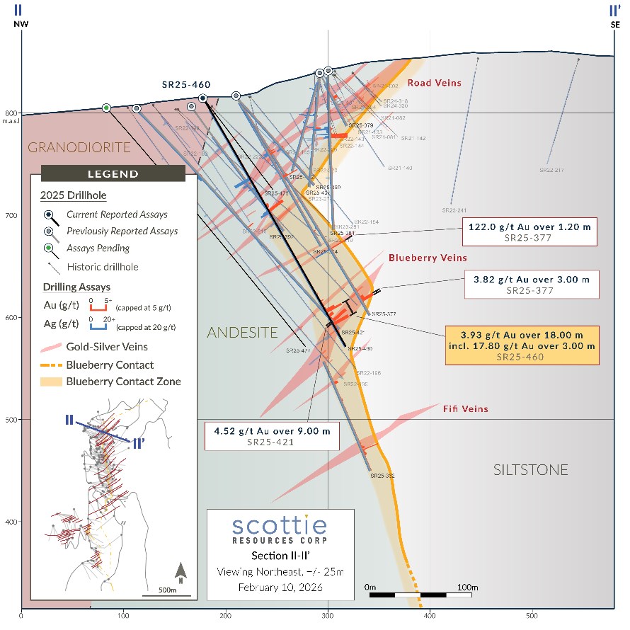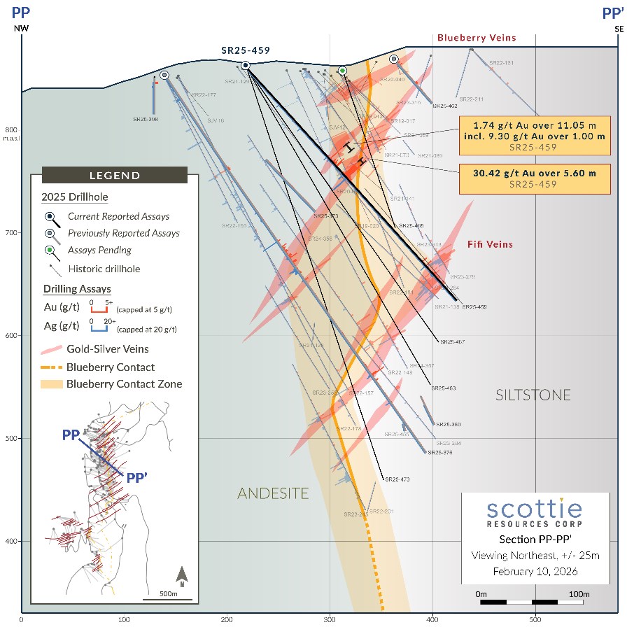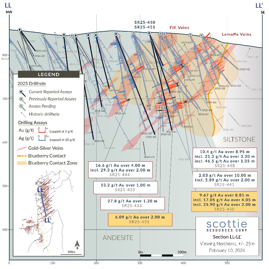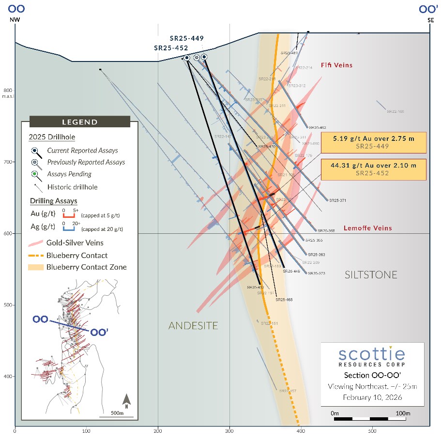 "These results continue to validate the strength of the Blueberry Contact Zone, delivering multiple high-grade intercepts from vein zones integral to the early years of our underground mine plan," said Thomas Mumford, President of Scottie Resources. "We're seeing improving continuity across wide, high-grade structures, which is encouraging from both a mining and development perspective. We continue to incorporate last years drilling into our modelling, further augmenting our drill planning for this coming season and providing us confidence in our ability to grow and enhance the value of this system."