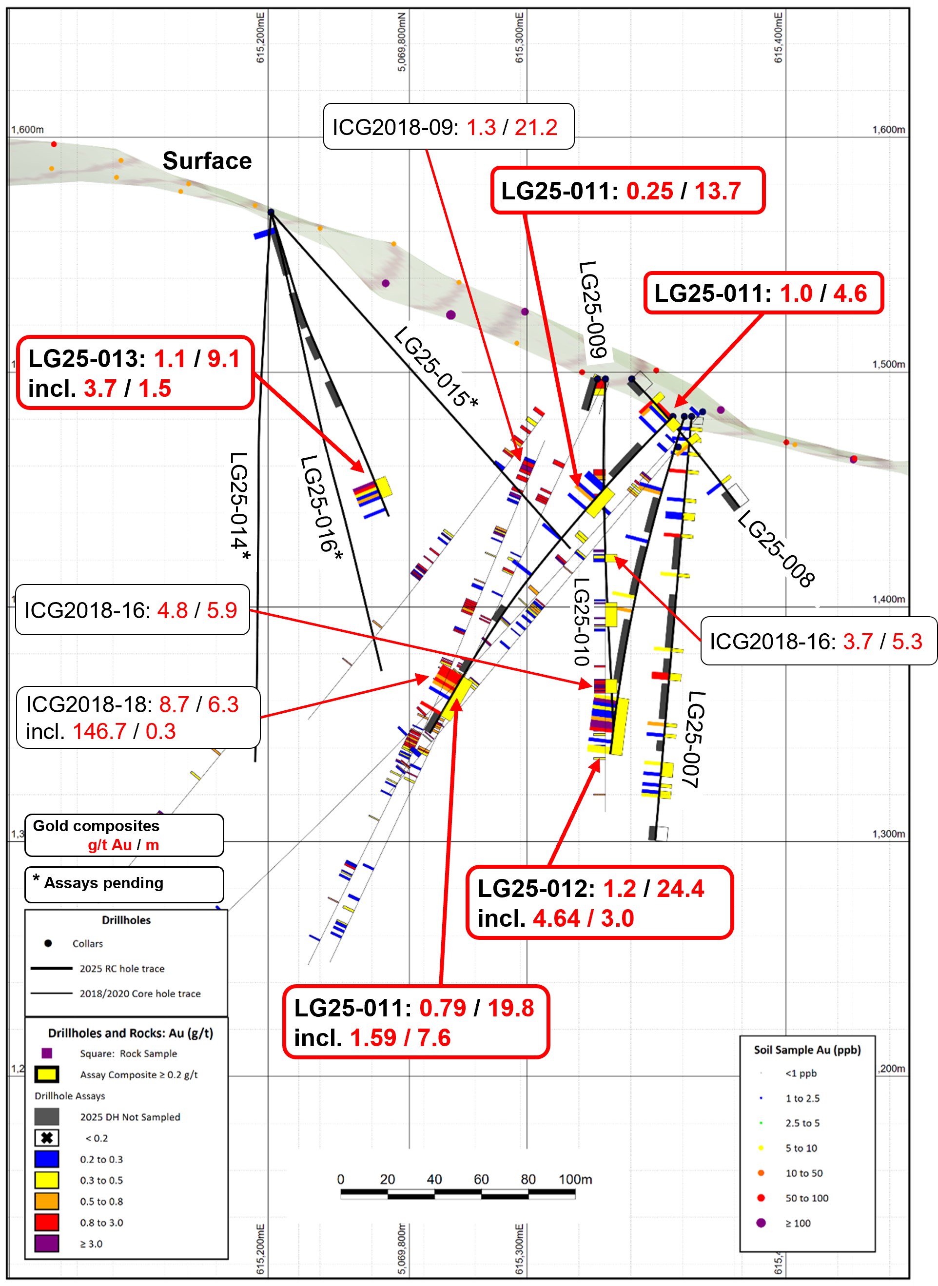 - LG25-011 was designed to target 25m southwest and below an intersection (from previous operators) of 8.7 g/t Au over 6.3m (20.7ft), including 146.7 g/t Au over 0.3m (1ft) from hole ICG2018-181. Hole LG25-011 intersected 0.79 g/t Au over 19.8m (65ft), including 1.59 g/t Au over 7.6m (25ft) at 61m south of and below the 8.7 g/t Au over 6.3m (20.7ft) intersection. Further sampling is being undertaken as the intersection ended with 0.92 g/t Au over 1.5m (5ft). Hole LG25-011 also intersected 1.0 g/t Au over 4.6m (15ft) right at surface. It also intersected 0.25 g/t Au over 13.7m (45ft) midway down the hole, aligning between the 3.7 g/t Au over 5.3m (17.4ft) targeted in hole LG25-012 and an intersection of 1.3 g/t Au over 21.2m (69.6 ft) from hole ICG2018-091.