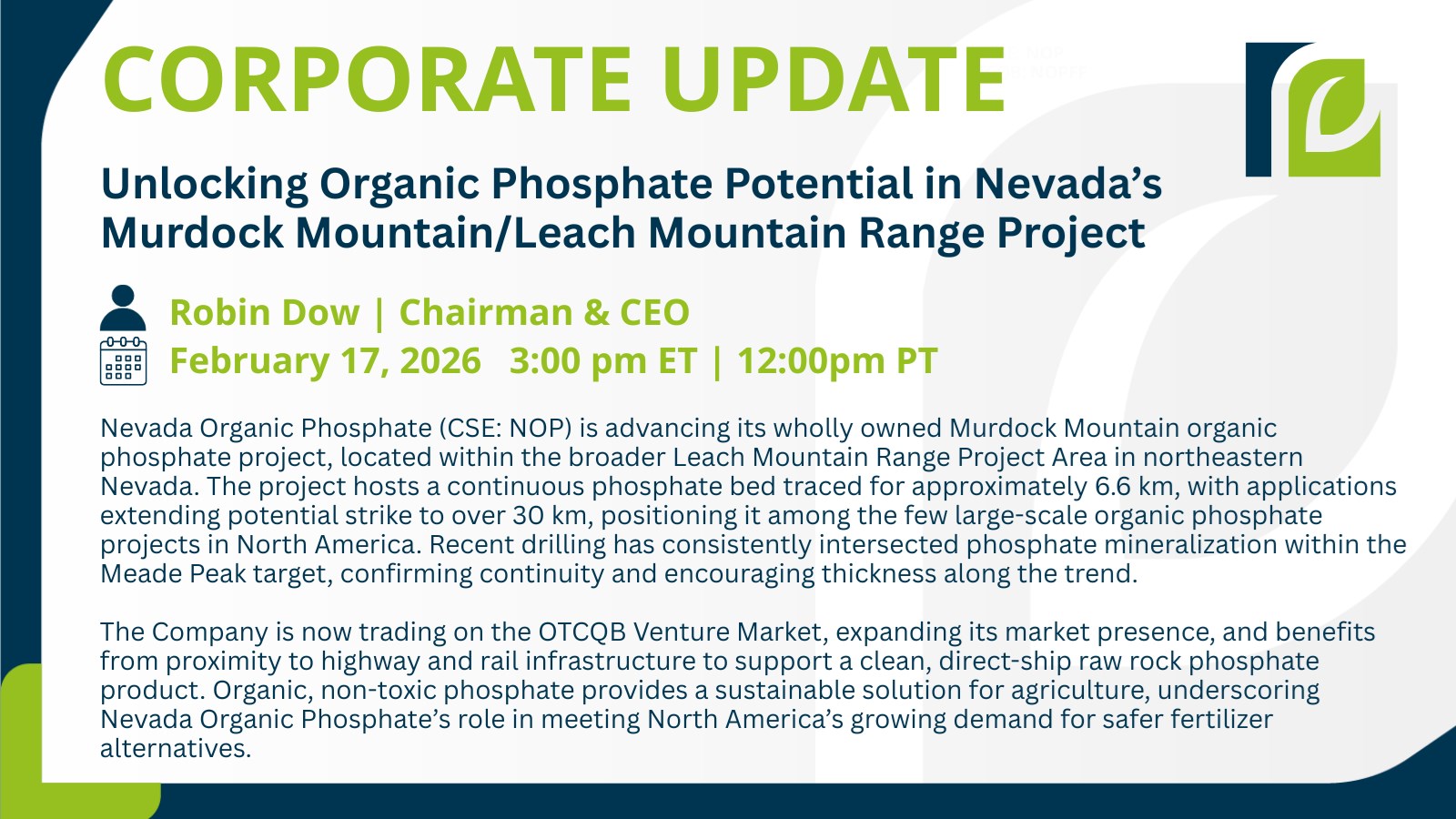 Toronto, Ontario--(Newsfile Corp. - February 10, 2026) - Nevada Organic Phosphate (CSE: NOP) (OTCQB: NOPFF) is pleased to announce that the company is presenting a live virtual corporate update hosted by Existing Agency Inc. on February 17 at 3pm ET.
