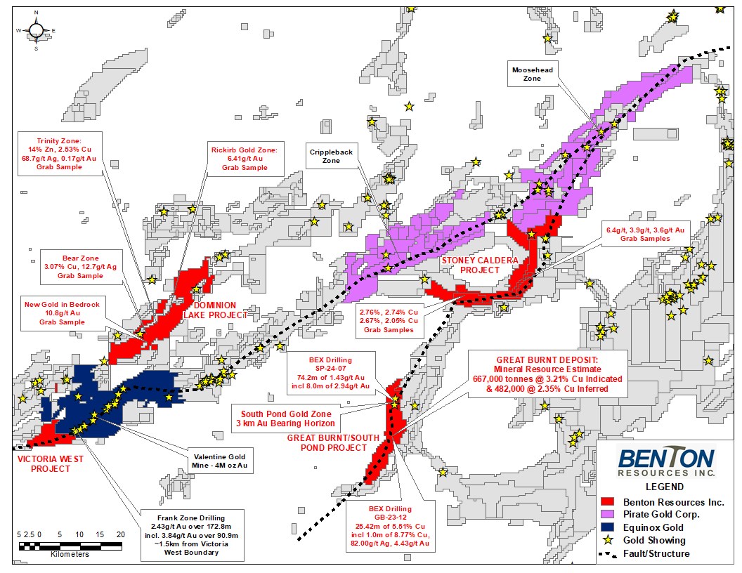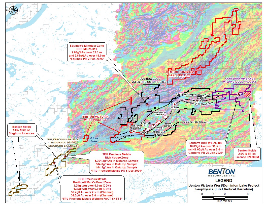 In addition and as soon as weather permits, Benton is planning a trenching program to expose several new areas of gold and base-metal surface showings discovered while prospecting last season on the Dominion Lake project. A recent announcement by Equinox Gold Corp. has created new excitement in Central Newfoundland, where they've discovered several new gold zones within their Valentine Gold property. These significant new results continue to show the huge potential for new discoveries in the region. Benton holds very large land positions at Dominion Lake and at Victoria West which covers the western continuation of the same stratigraphy and geology as that of the Equinox discoveries.