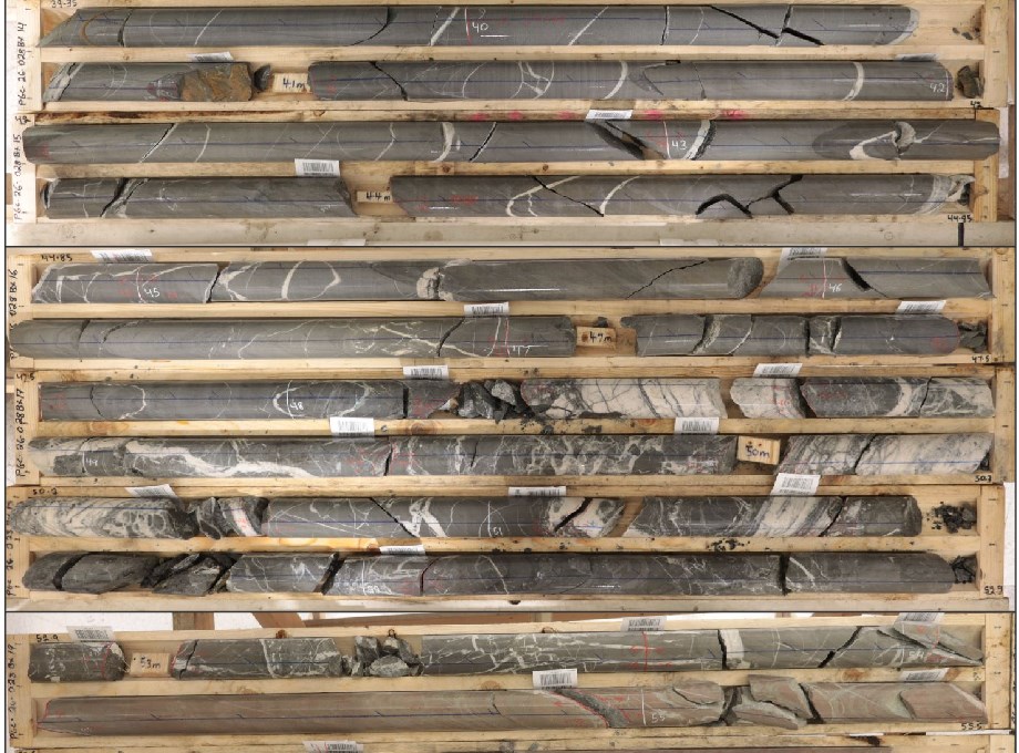 | PGC-26-018 | Moosehead Eastern Trend Northern Ext | Intersected fault zones at 21, 25.4, 39.2, 50.6m downhole with 25cm brecciated quartz vein at 54.05m. |