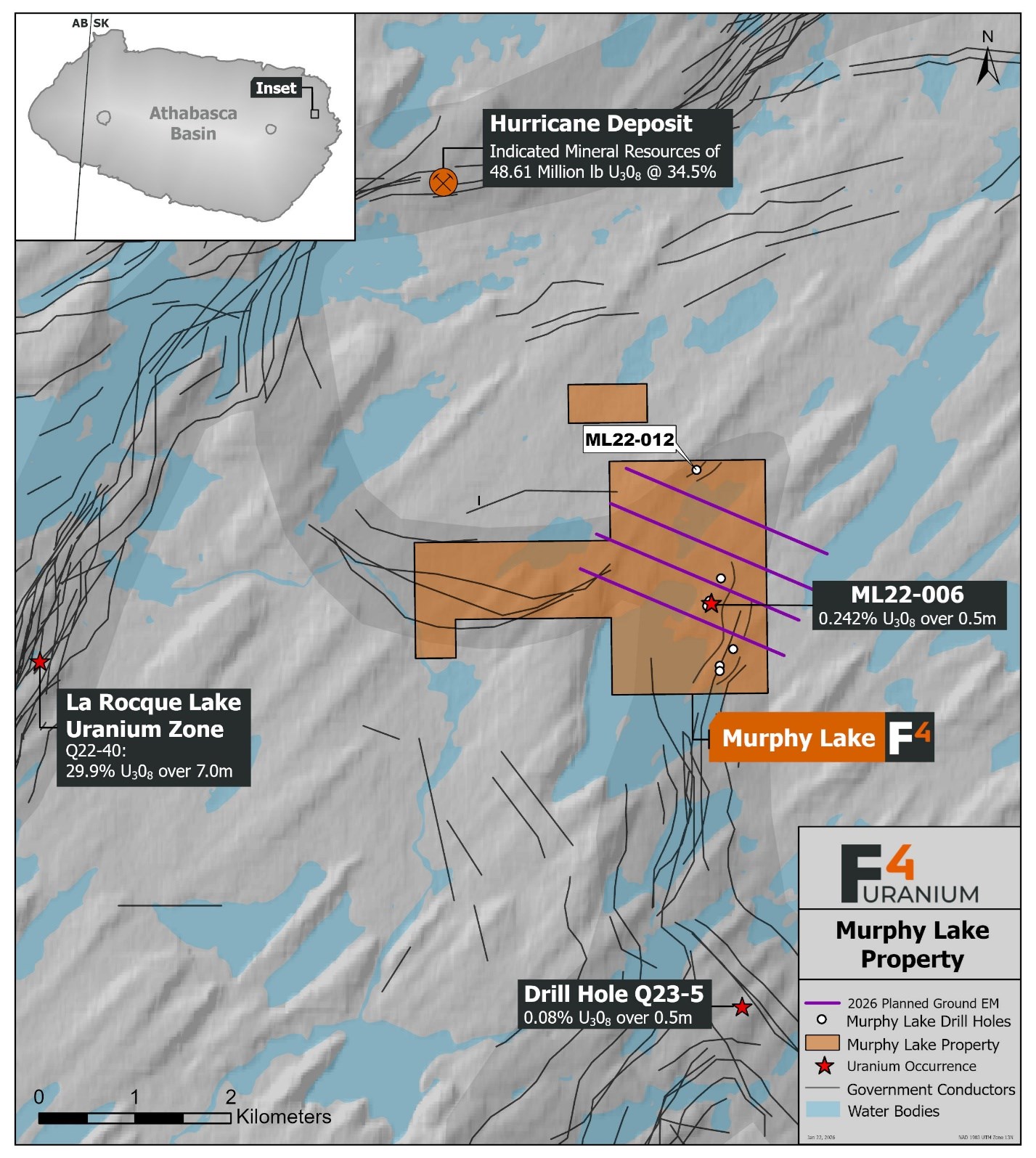 Kelowna, British Columbia--(Newsfile Corp. - February 17, 2026) - F4 Uranium Corp (TSXV: FFU) ("F4" or "the Company") is pleased to announce plans to commence ground EM geophysics at Murphy Lake, 5 kilometers South of IsoEnergy's High-Grade Hurricane Deposit and 4 kilometers east of Cameco's La Rocque Lake Uranium Zone.