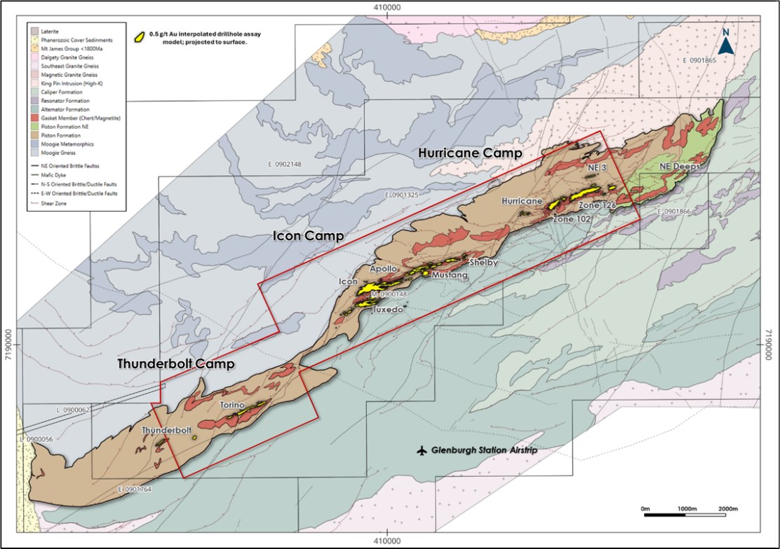 The 100%-owned Glenburgh Gold Project is rapidly emerging as a new frontier gold district with multi-million-ounce potential. Located in Western Australia's Gascoyne region, Glenburgh is an 18-20 km mineralised corridor centred on three known 2-3km long camps: Hurricane, Icon, and Thunderbolt. Exploration continues for more.