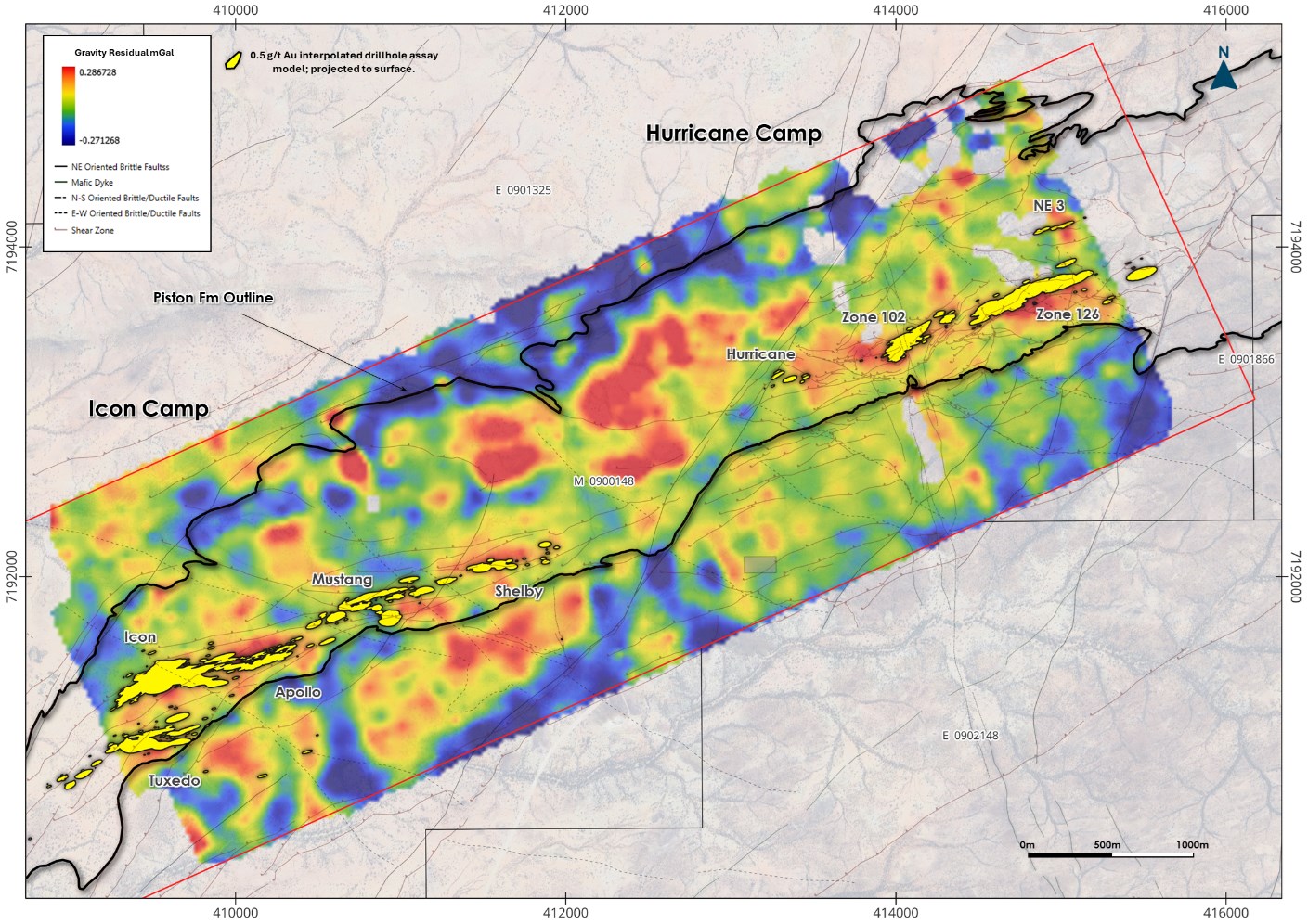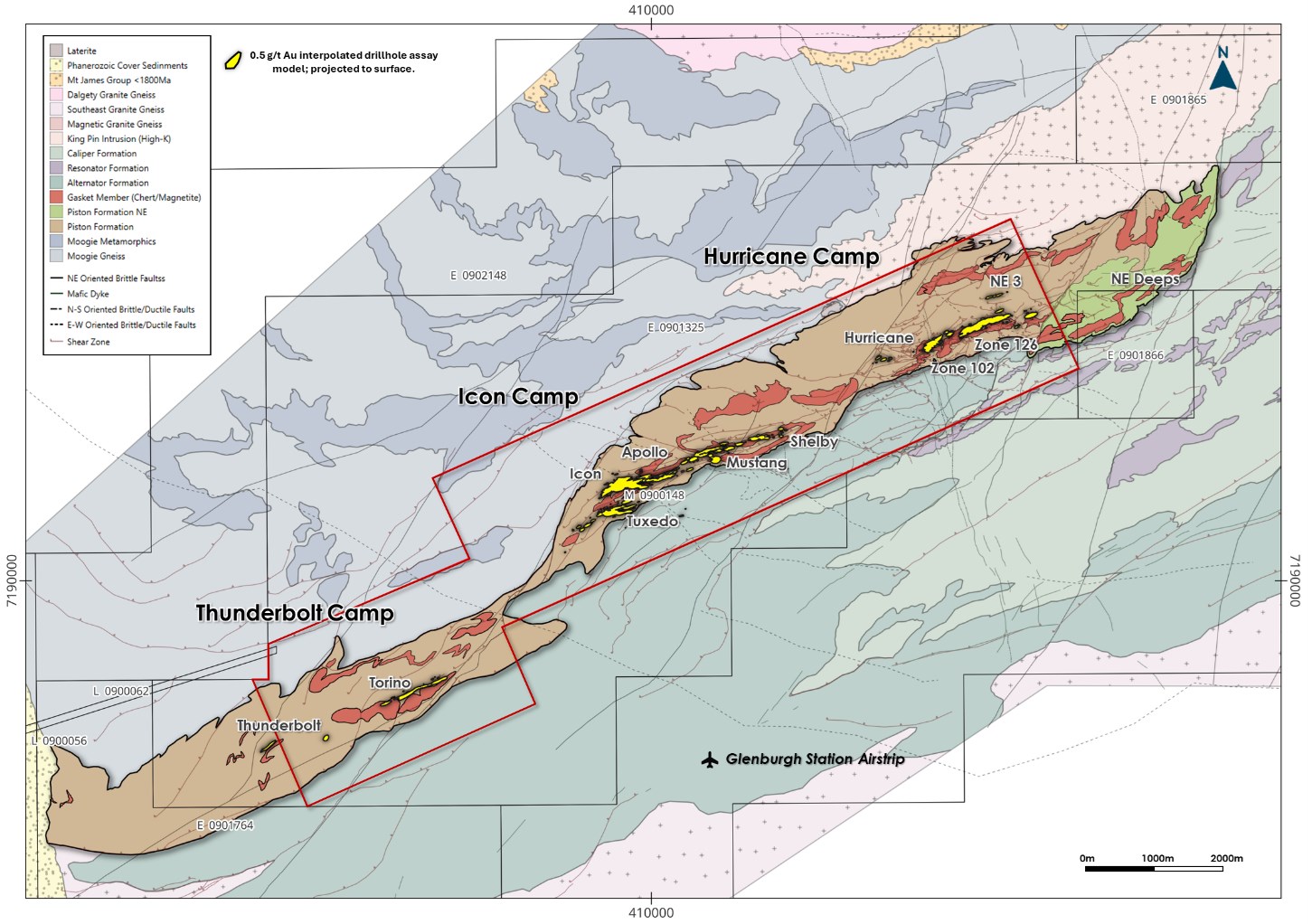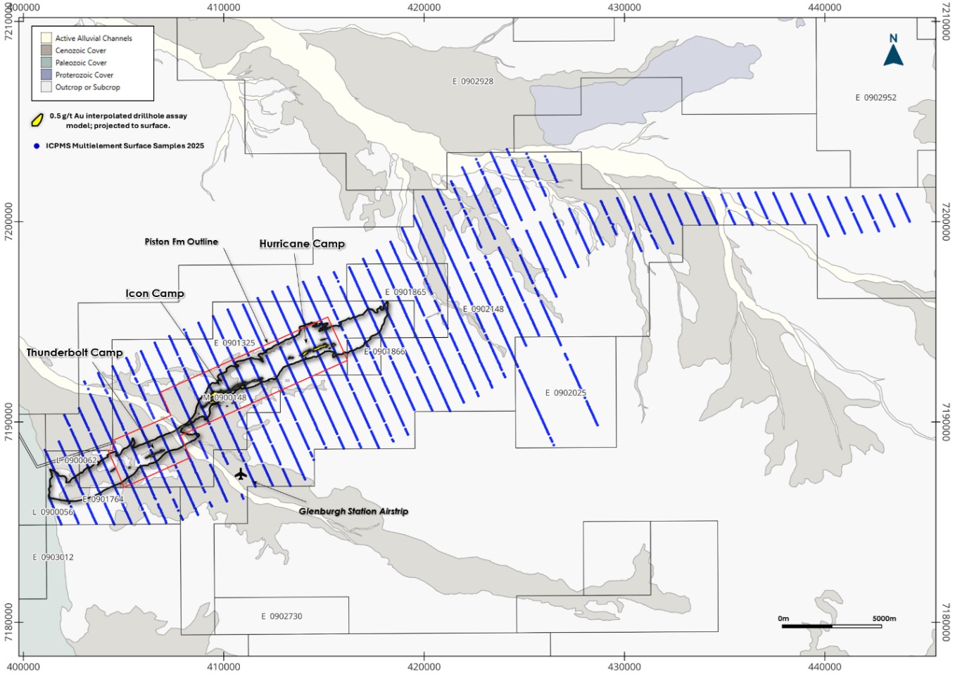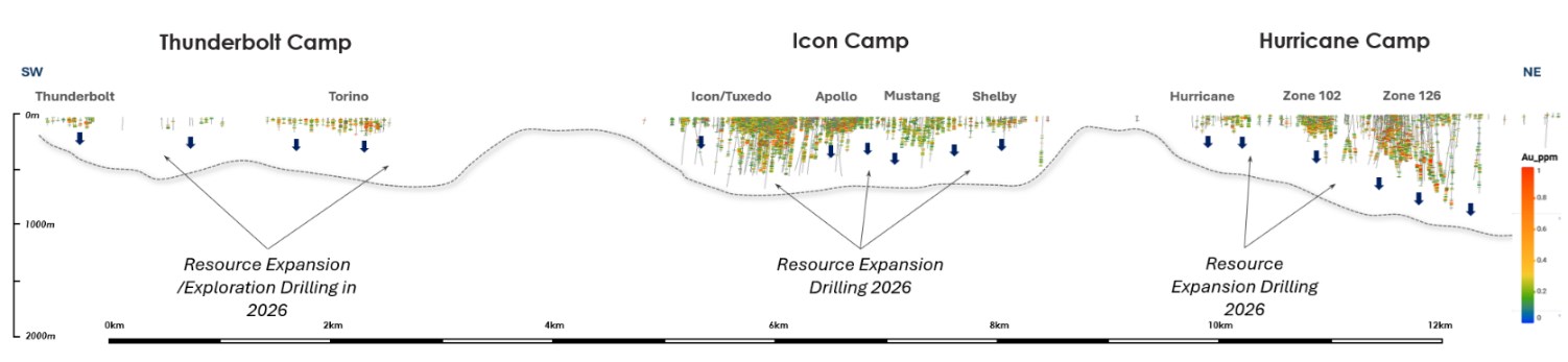 - Icon Camp (Icon, Tuxedo, Apollo, Mustang, Shelby): systematic testing of the >3km Icon trend to approximately 300-500m, supporting bulk-tonnage scale open-pit potential