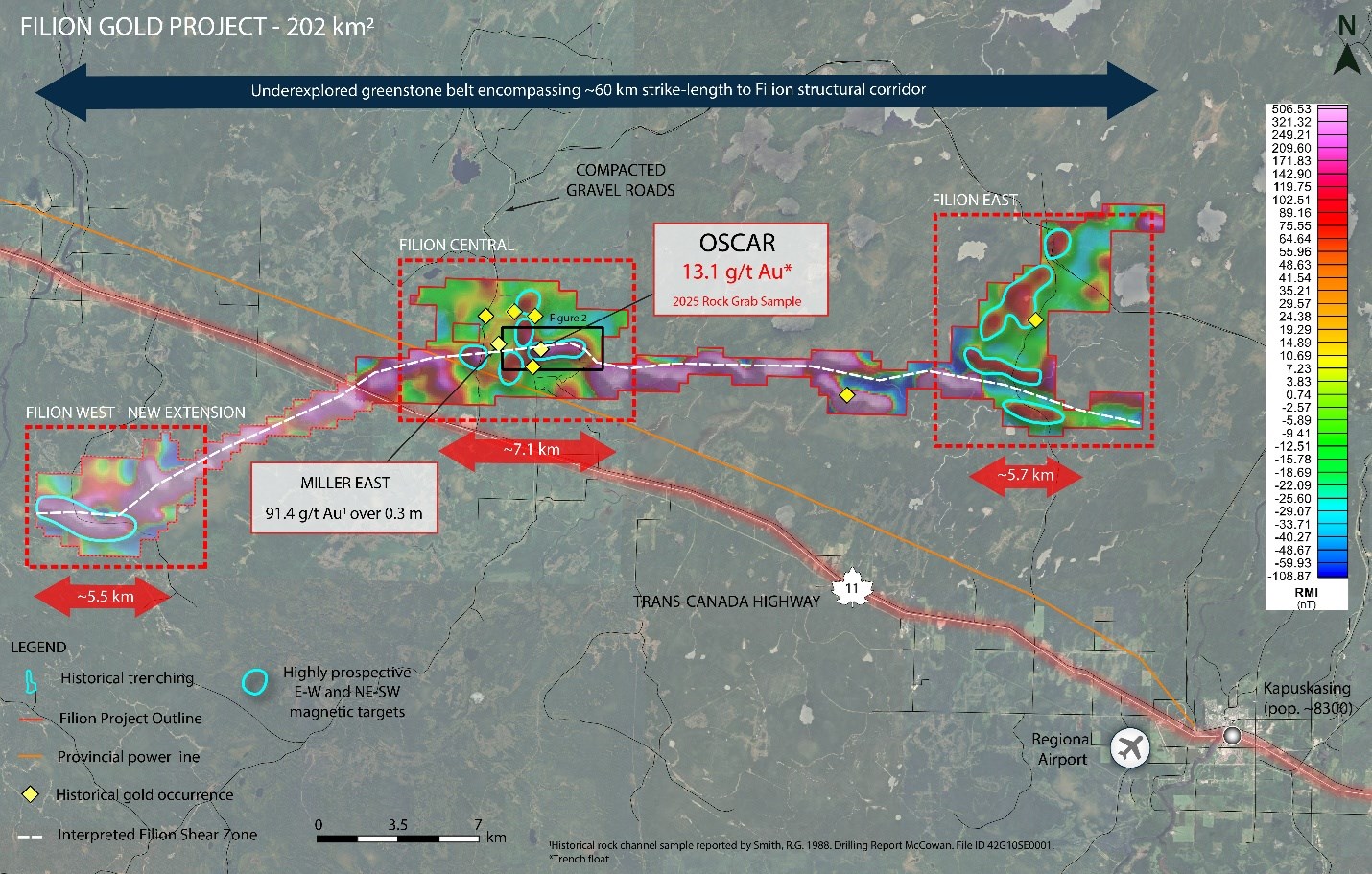 Figure 1. Regional residual magnetic intensity (RMI) geophysical survey outlining the Filion Gold Project with annotated target areas and location of the Oscar gold occurrence with select 2025 rock grab sample.