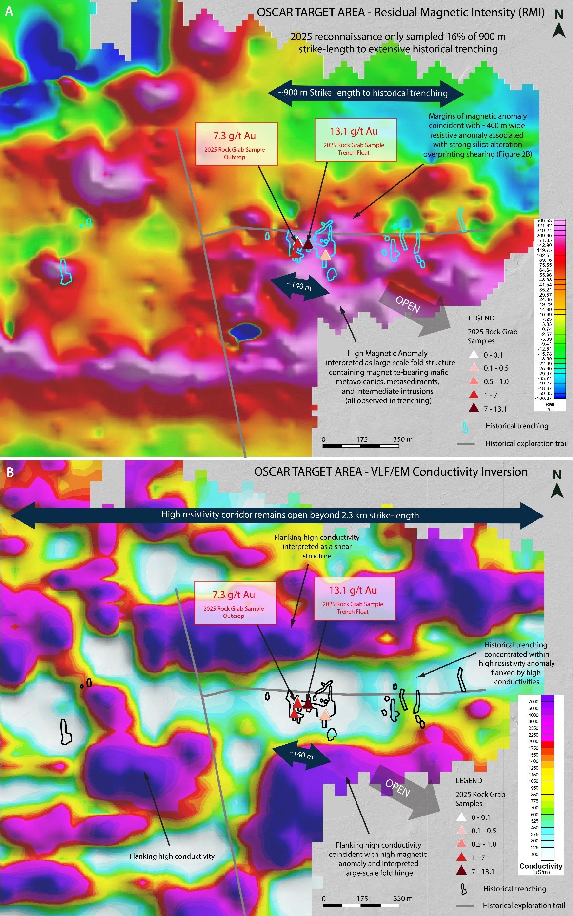 Figure 2. A. Vertical derivative of the 2025 residual magnetic intensity (RMI) ground magnetic survey with annotated interpretations, LiDAR trench outlines, and 2025 rock grab sampling with select results. B.VLF-EM inversion model displaying conductivity depth slice at 50 m.