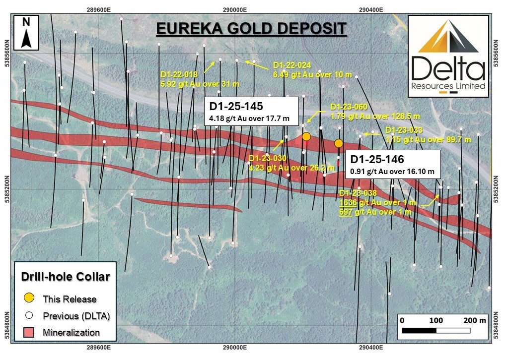Assay results include 4.18 g/t Au over 17.7 metres, 0.74 g/t Au over 11.7 metres, and 0.89 g/t Au over 13 metres in hole D1-25-145, and 0.91 g/t Au over 16.1 metres and 1.14 g/t Au over 7.3 metres in hole D1-25-146 (Table 1). Both holes were drilled approximately 40 metres from the nearest previously completed hole. Nearby intercepts from prior Delta drilling include 5.92 g/t Au over 31 metres (D1-22-018) and 1.79 g/t Au over 128.5 metres (D1-23-060).
