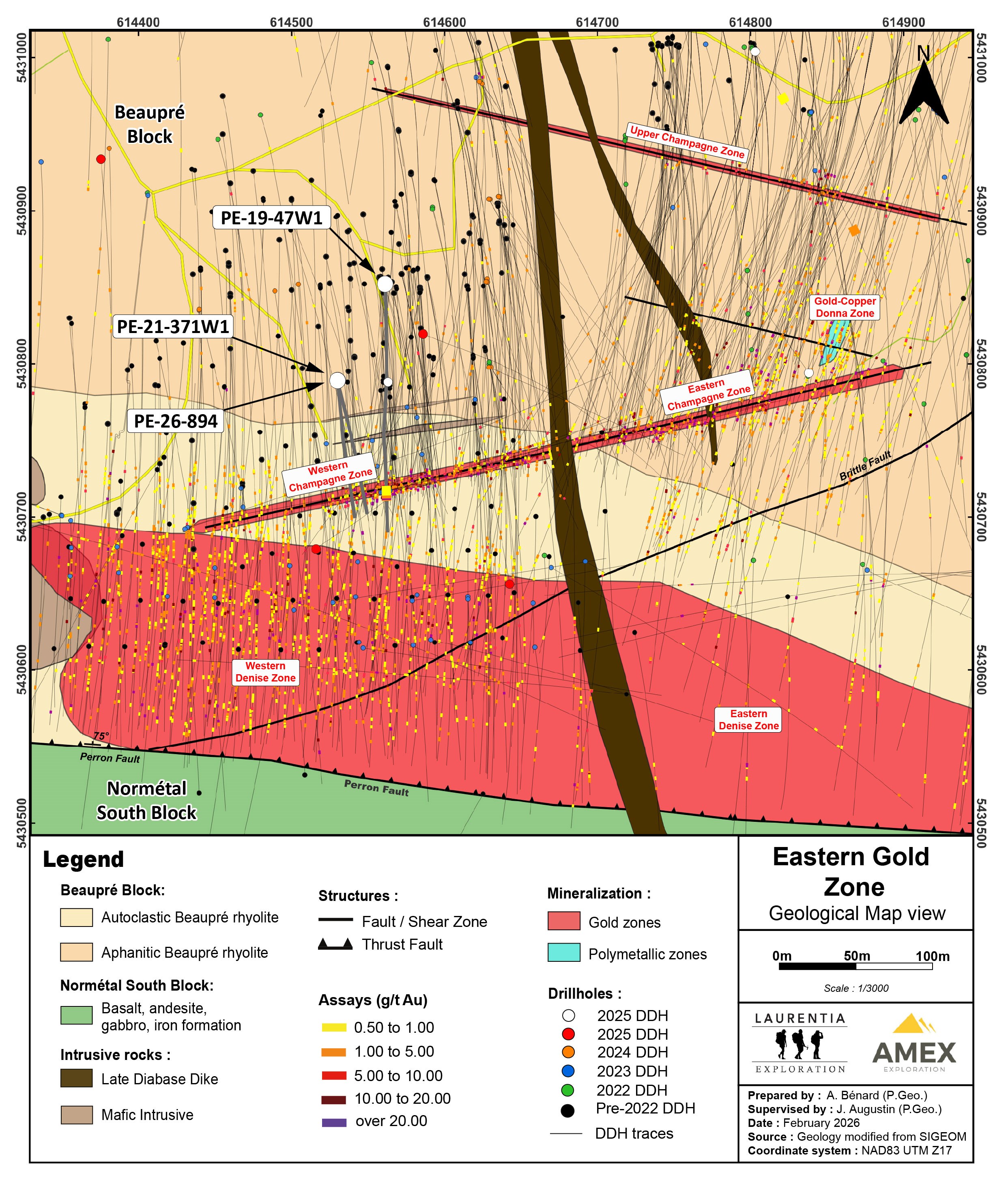 Montreal, Quebec--(Newsfile Corp. - February 18, 2026) - Amex Exploration Inc. (TSXV: AMX) (FSE: MX0) (OTCQX: AMXEF) ("Amex" or "the Company") is pleased to announce the results from the first hole of an ongoing grade control program designed for the bulk sample ("bulk sample" or "bulk") of the Champagne Zone (see Figures 1-3). In addition, multiple grains of visible gold have been identified in the visual core logging from the second and third holes of this program, with results expected to be received in the coming days (see Figure 4).