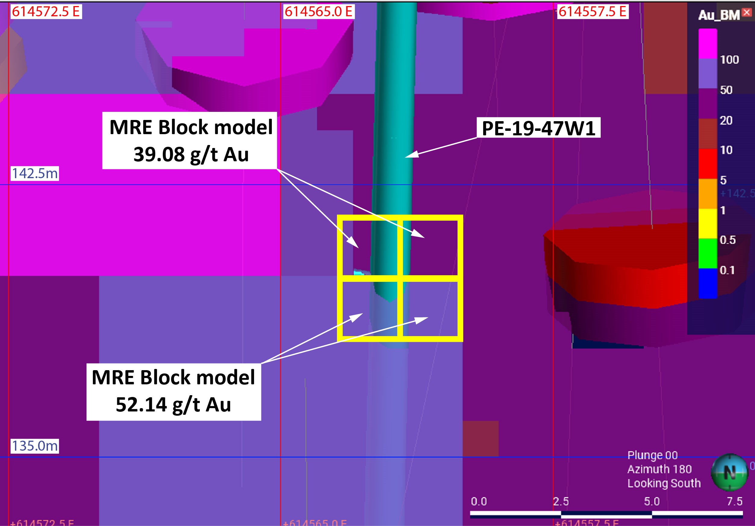 Figure 3: Screenshot from Perron Leapfrog Geo project showing the intercept of grade control hole PE-19-47W1 into the existing block model. Assay results of 426.64 g/t Au and 218.69 g/t Au will in theory increase the grade of the block model in this area. Note - this assumption will only be realised once the area of the Champagne Zone for the bulk sample has been remodelled.