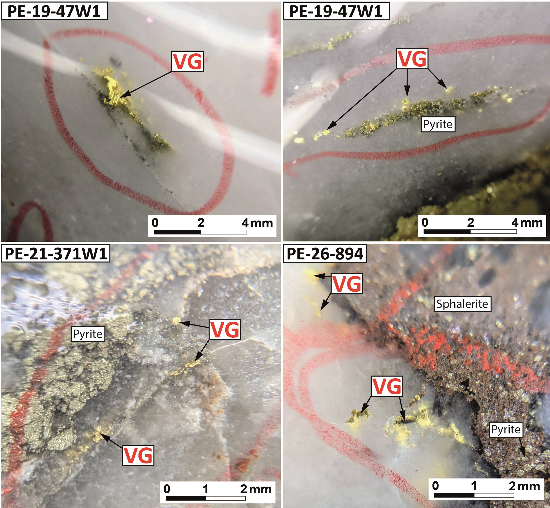 Figure 4: Photos d'or visible dans la Zone Champagne provenant des trous PE-19-47W1, PE-21-371W1 et PE-26-894. La minéralisation est représentée par des veines de quartz-carbonate-sulfures aurifères contenant de l'or visible, encaissées dans la rhyolite aphanitique de Beaupré.