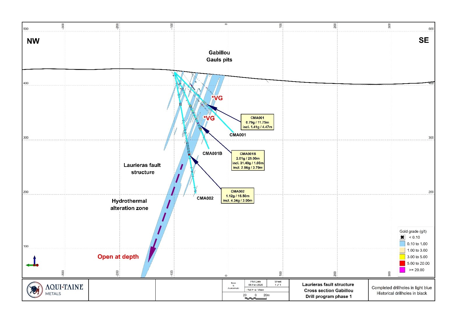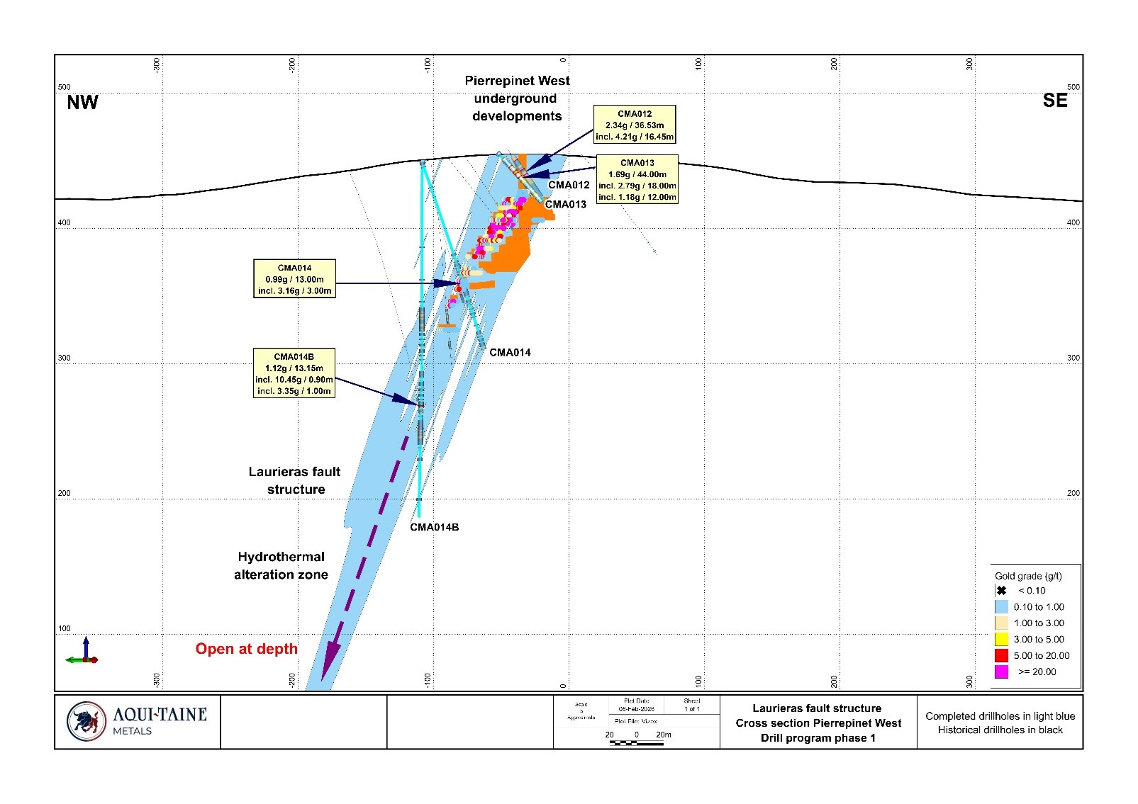 Drill holes CMA001, CMA001B and CMA002 tested the lateral and down dip extension of the historical Pierrepinet West site. This area was previously shallowly drilled but remained unmined by COGEMA in the 1990s, and hosts an extension of the main mineralized Laurieras structure into what is referred to as the Gabillou target. A large Gallic mining complex consisting of several open pits ranging from tens of metres to over 100 metres in length are present in this area. Aquitaine's drilling confirms that the area hosts an extension of the Laurieras mineralization, including high-grade gold associated with polymetallic ore minerals, within a broader envelope of lower grade mineralization.