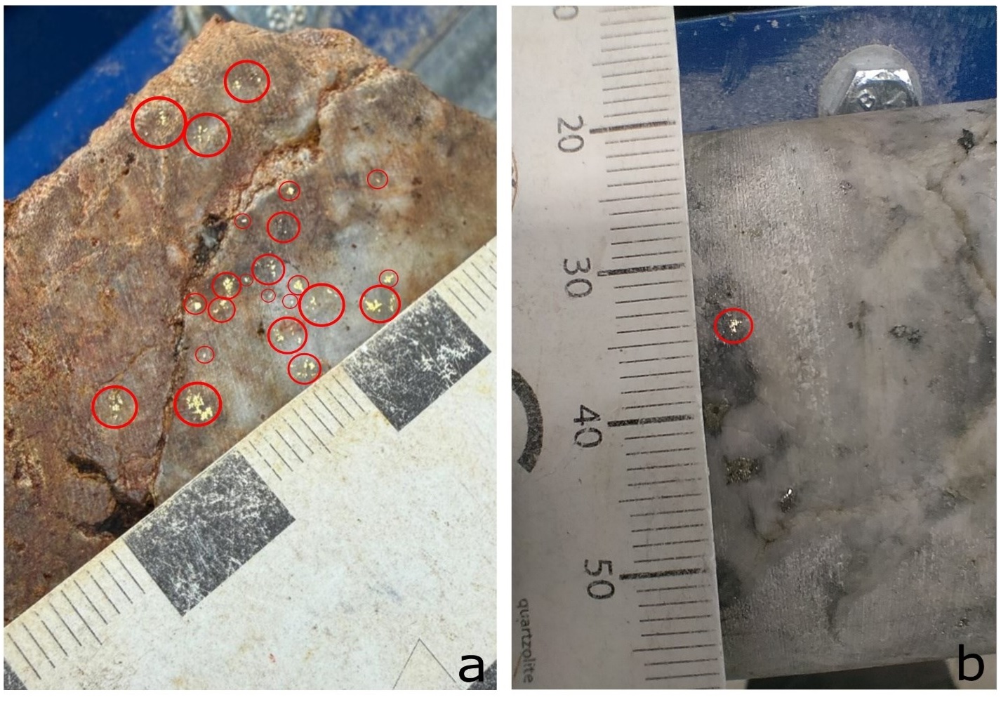 - White and grey multi-stage quartz vein with visible gold from drillhole CMA028A - 70m above the last underground development in Laurieras Center from 203.00 to 203.50m.
