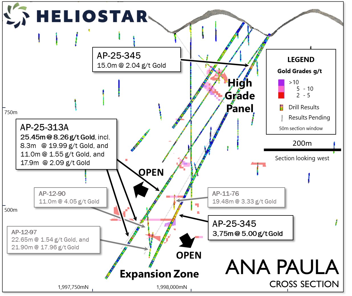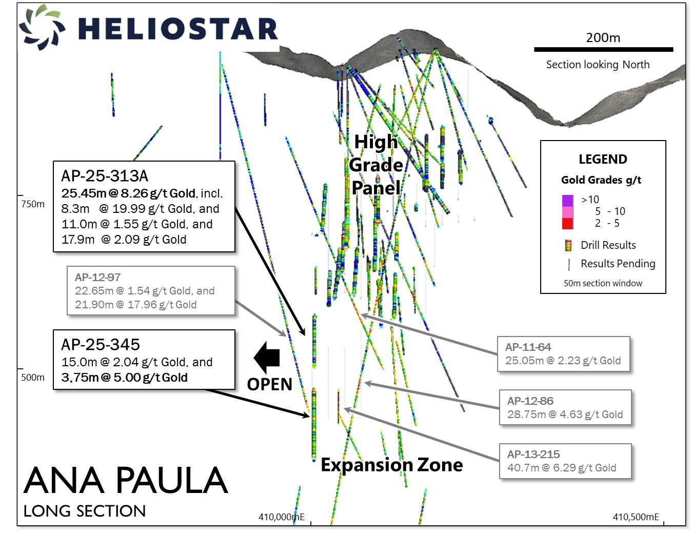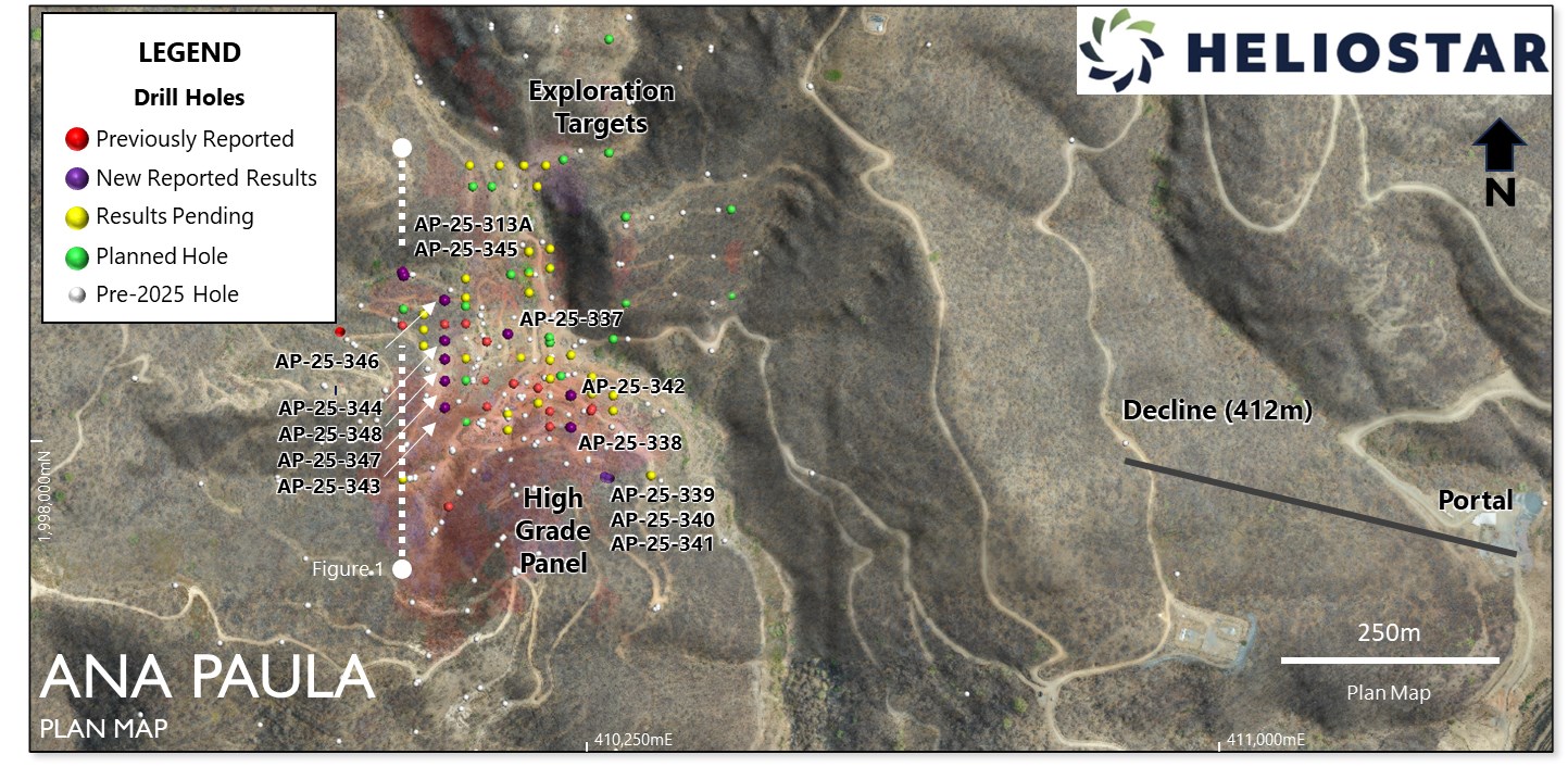 Heliostar CEO, Charles Funk, commented, "During the reserve conversion drill program at Ana Paula, we decided to push a hole deeper to test for potential step-outs of the Expansion Zone. Hole AP-25-313A represents a 70 m step out from the nearest intercept supporting ore stopes and returned a strong interval of 25.45 m grading 8.26 grams per tonne gold. This is an exciting result from the Company's first hole beneath the High Grade Panel and based on this success, we have extended a number of additional holes deeper at Ana Paula. Two results from the Expansion Zone are reported today with the remaining assay results pending."