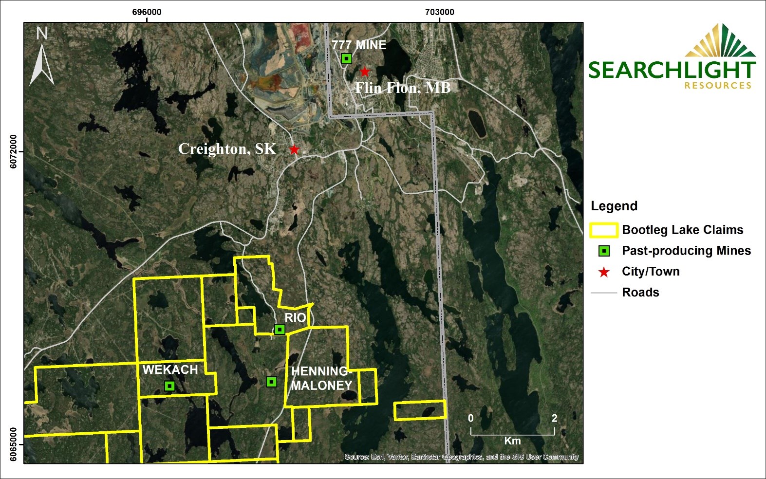 "Searchlight is evaluating the potential of establishing a modern gold mining operation on the Bootleg Lake property, centered on the Rio Mine portal, but also including other 100% owned gold properties nearby. These prospects include the Henning Maloney mine, where Searchlight has conducted a successful drill campaign under the old workings, the Wekach Mine, and the Robinson Creek prospect where substantial drilling has taken place by other operators," stated Stephen Wallace, Searchlight's CEO.