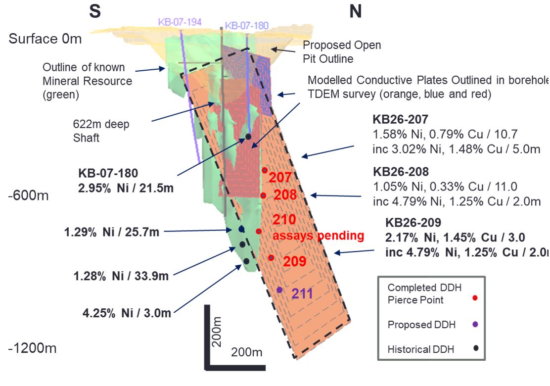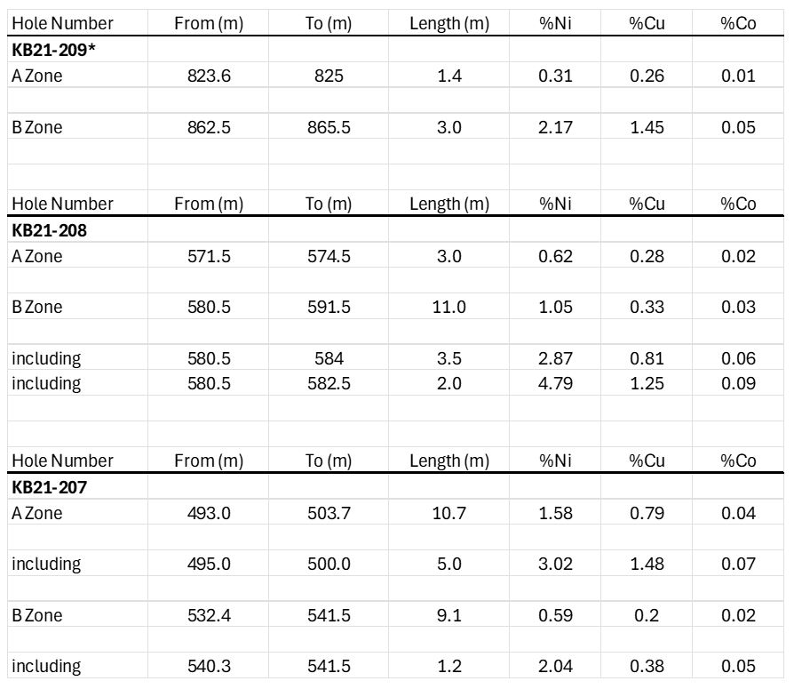 Reported in this release are the results from the 3rd infill drill hole KB26-209. Results from the hole confirm both A and B zones were intersected as outlined in the Table 1 below. Zone A was intersected from 823.6 to 825.0m drill depth and returned 0.31% Ni, 0.26% Cu over 1.4 metres. Zone B was intersected from 862.5m to 865.5m drill depth. Results were 2.17% Ni, 1.45% Cu over 3.0 metres. Drill core intersection widths are estimated to be between 65 and 80% true width.