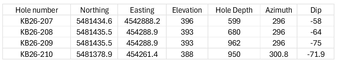 A total of 3,350m of drilling has been completed to date. The first 4 drill targets have been completed (drill holes KB26-207, KB-208, KB-209 and KB-210 outlined on Figure 1). Samples have been delivered to AGAT Labs in Thunder Bay for analysis. Assays are pending for hole KB26-210. The drill rig is currently drilling the 5th drill hole KB26-211. This hole is designed to be drilled below the existing shaft bottom to test for the depth extension to the deposit.