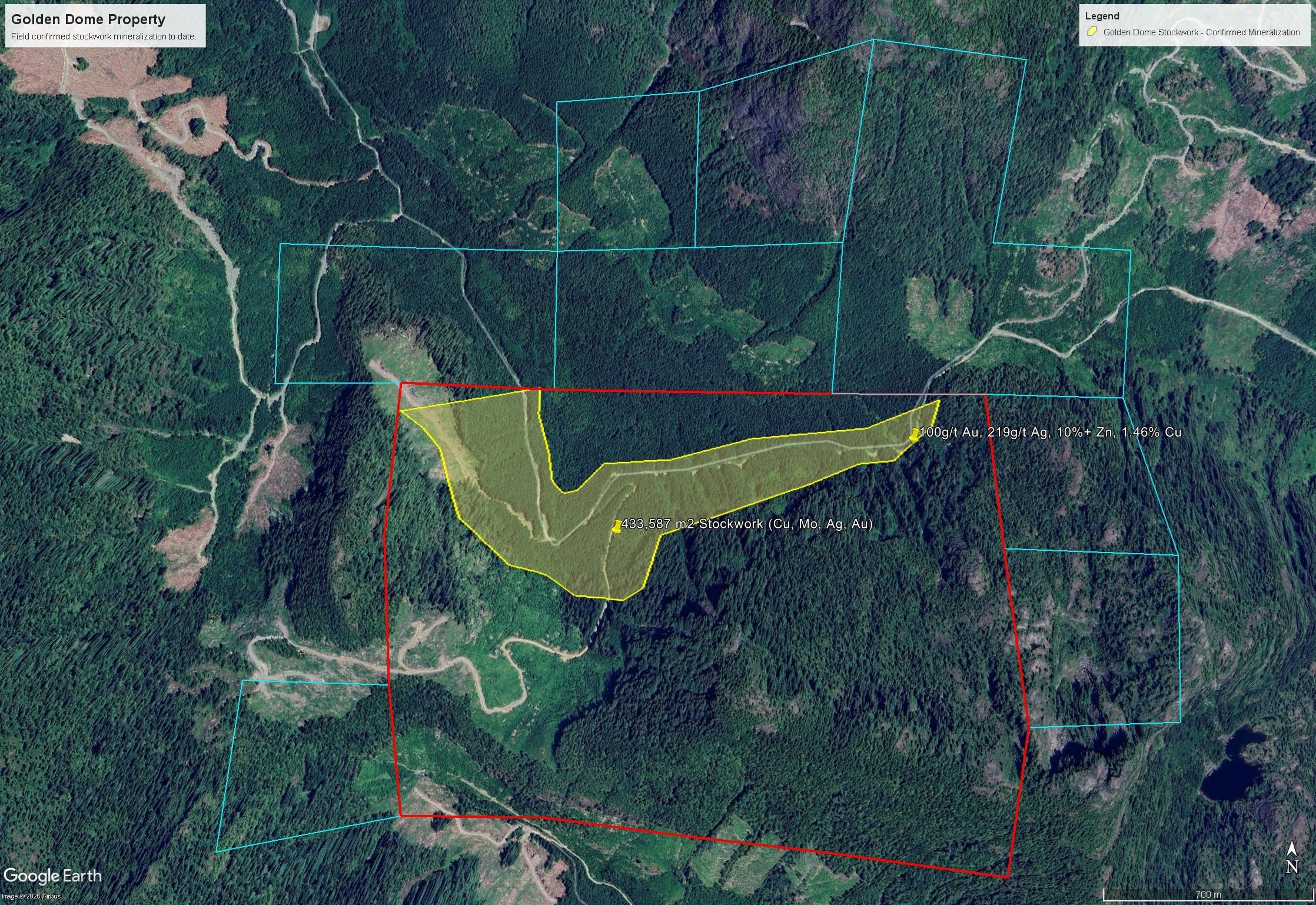 The Golden Dome Claims are shown on the map below, with the Application Claims outlined in blue. A potentially continuous porphyry/stockwork system of significant size has been observed at surface and appears to cover an area of 430,000 square meters or more. The system extends over 3km, has been walked to as much as 500m in width, and covers an elevation change of 300m from one end to the other (all observed from following surface structure by foot). The system also has mineralized quartz veins running throughout, with one such vein (location indicated on Map 2 below) having been sampled in the year 2000 by Jacques Houle, the Company's former (now retired) consulting geologist and a Qualified Person under National Instrument 43-101. The sample returned 100+ g/t gold (not tested for over-limits), 219 g/t silver, 1.46% copper and 10% zinc.
