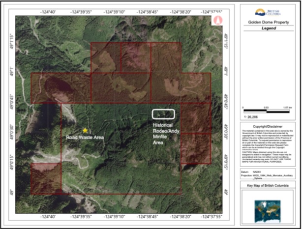 Map 3 - Golden Dome Claims showing identified road waste rock area and previous minfile area