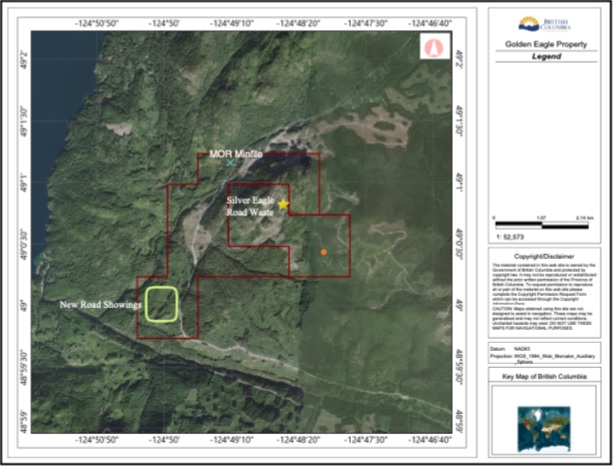 Map 4 - Golden Eagle showing previous ARISBC report location (MOR), road waste rock area, and the 4m wide vein at the new road showing location