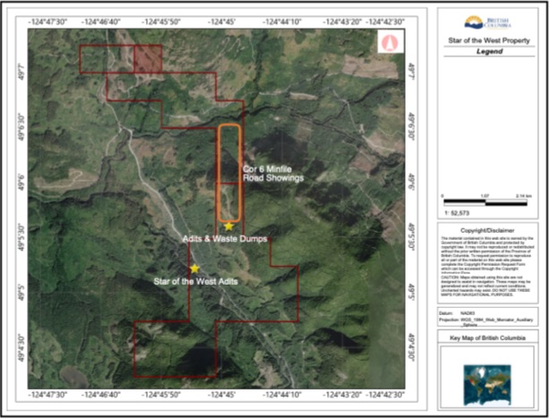 Star of the West is comprised of three Acquired Claims (#11263931, #1149486 and #1129485) covering 634 hectares and a single Application Claim (#1124962) covering an additional 21 hectares, as shown in Map 5 below.