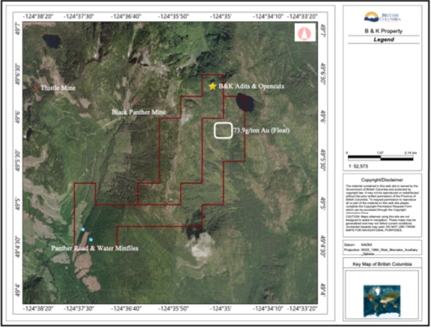 Of all the added Claims, B & K is the only with difficult access, requiring a hike in by foot along old overgrown logging roads. Previous artisanal gold mining has been reported, and the Company expects to find old adits and waste rock piles. Previous reports and new sampling has produced some good results, including: