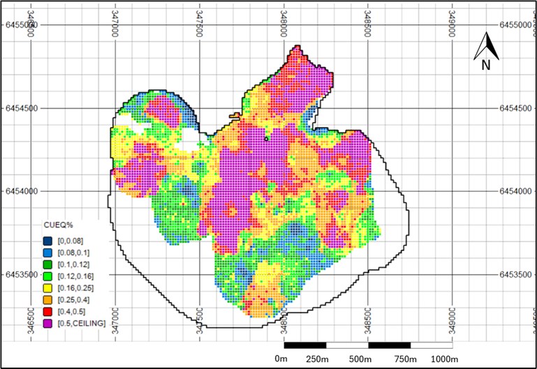 Figure 3 : Vue en plan à 715 m au-dessus du niveau de la mer du modèle de blocs montrant la distribution de la classification en équivalent cuivre à l'intérieur du contour de l'enveloppe d'optimisation de la fosse à 120 kt/j (UTM, fuseau 9N [NAD83]).