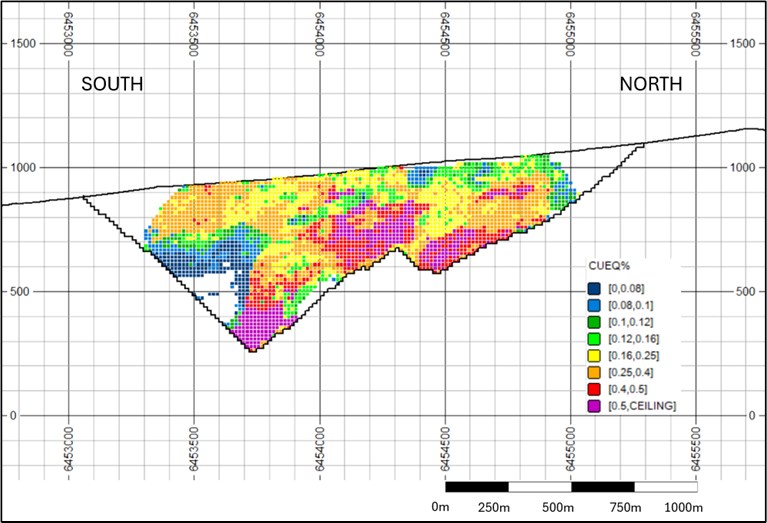 Figure 2 : Coupe transversale à l'Est 348 000, vers l'ouest, du modèle de blocs montrant la distribution de la teneur en équivalent cuivre à l'intérieur du contour de l'enveloppe d'optimisation de la fosse à 120 kt/j (UTM, fuseau 9N [NAD83]).