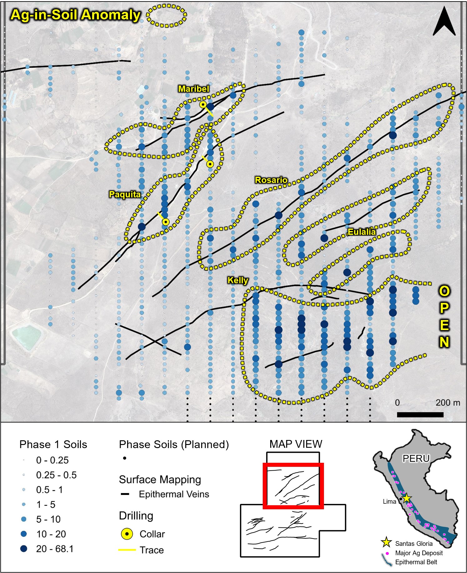 Peak value of 68.1 ppm Ag; the Kelly anomaly is the largest and highest-intensity corridor (approximately 850 m x 400 m) and is open to the east at the current sampling boundary;