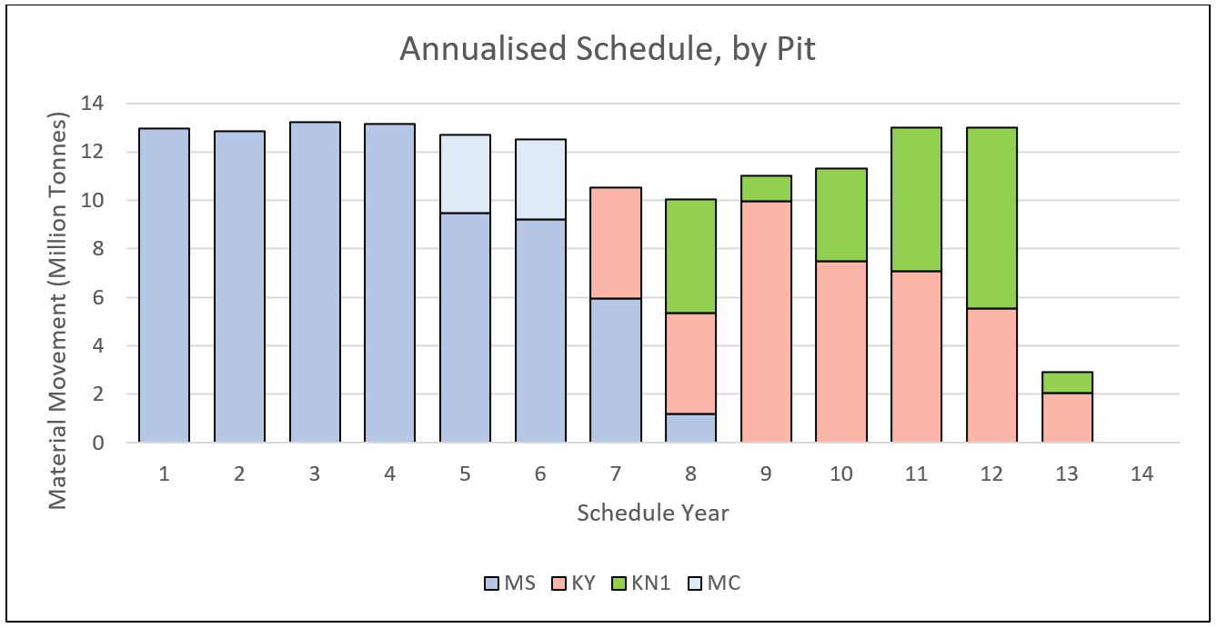 Figure 1. Annualized mining schedule, by pit. (MS=Mankouke South, KY=Kabaya, KN1, Mankouke Central)