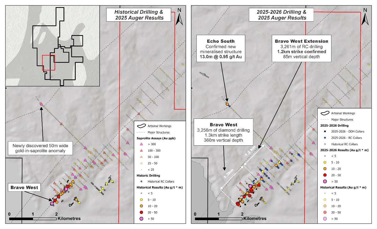 At Bravo West, RC drilling extended the mineralised trend by an additional 1.2 kilometres towards the northeast along strike, increasing the total strike length to approximately 2.5 kilometres (Figures 1 and 2). The Bravo structural corridor remains open towards the northeast for an additional 1.7 kilometres until the eastern boundary of the Sakassou permit.